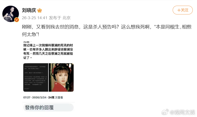 刘晓庆辟谣去世传闻3月25日,发文:刚刚,又看到我去世的消息,这是杀人预告吗?这么想我死啊,“本是同根生,相煎何太急”!