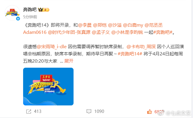 宋雨琦周深暂离奔跑吧 跑男人气双煞暂别,周深的综艺感、宋雨琦的爆发力缺席,本期节