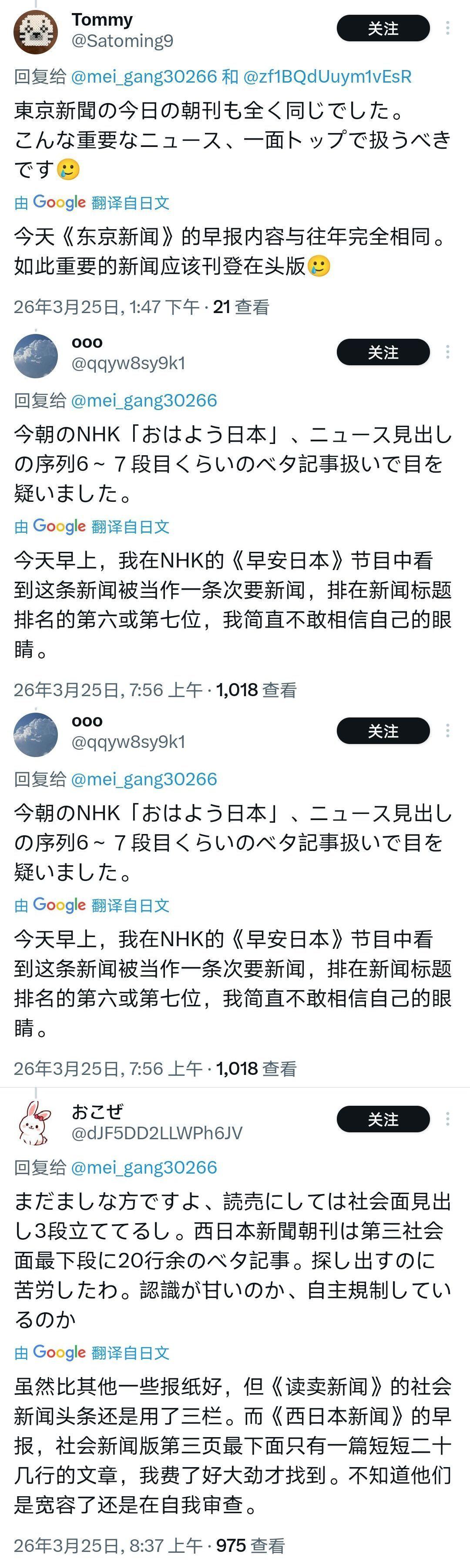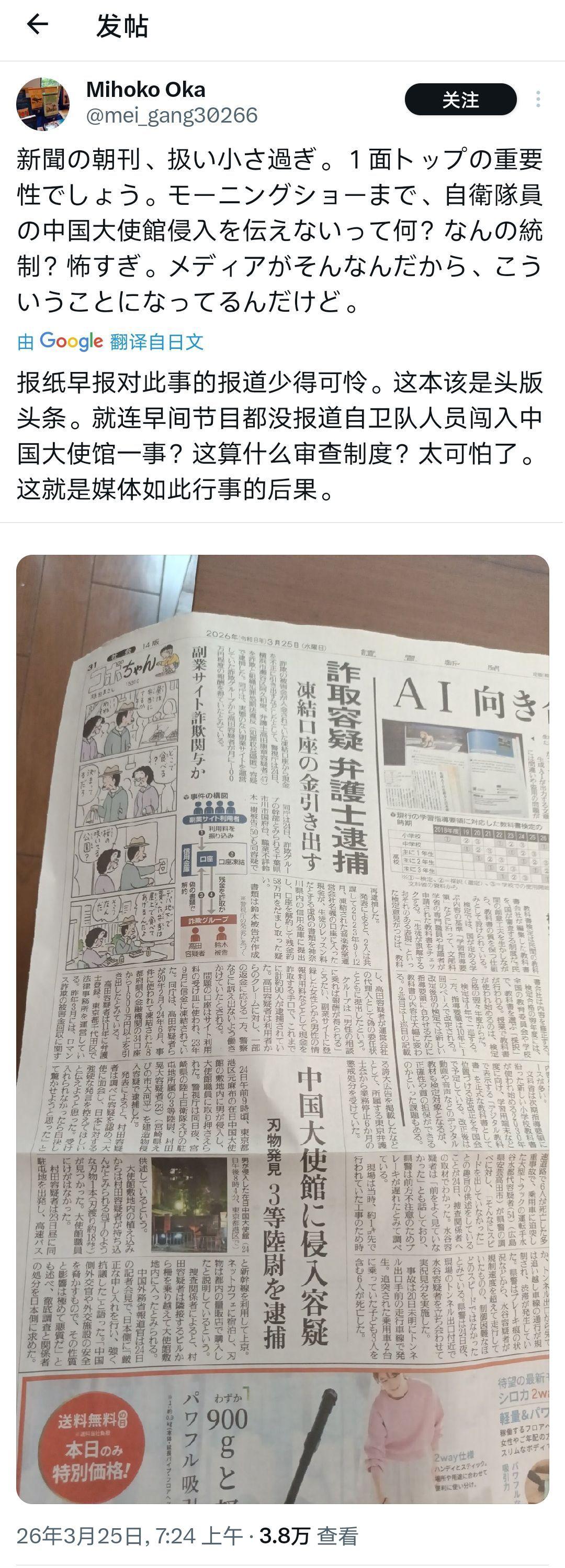 日本网友反应:自卫队持刀闯中国使馆,媒体集体“看不见”? 现役自卫官持刀闯入中国驻日使馆,威胁杀害外交人员——如此严重的事件,日本主流媒体却集体冷处理。 NHK《早安日本》将其排在新闻标题第6、第7位,《每日新闻》《东京新闻》同样轻描淡写。日本网友怒了:“我怀疑自己的眼睛!”“媒体没有尽到应有的责任!” 更讽刺的是,一名网友晒出报纸版面——如此重要的外交事件,头版却不见踪影。 没人下令,但所有媒体都在做同一件事。这就是日本社会的“读空气”:大事化小,小事化了,直到没人再提。 “如果没有自媒体,日本人根本不会知道这件事”——这条高赞评论,道出了最残酷的真相:当一个国家的媒体集体“看不见”,民众就只能靠社交媒体互相当眼睛。 只是这一次,日本网友眼睛没瞎,但日本媒体“选择性失明”得太刺眼了。 很好奇,这是在塑造什么样一种国民性?这个民族,历来如此吗? Source: X