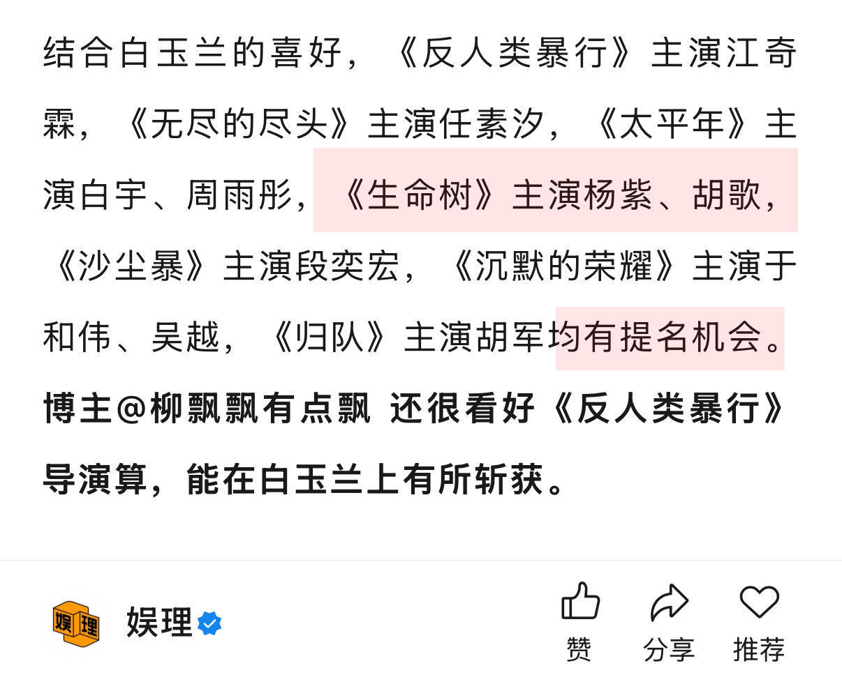 前哨奖与白玉兰关联度有多大 杨紫凭《生命树》回归现实题材,杨幂通过《生万物》首次冲击白玉兰。谭飞认为视后大概率会在孙俪和杨幂中诞生,而中戏专家则很看好杨紫,视后大年,你觉得哪朵花能赢?业内谈肖战杨紫白玉兰得奖几率