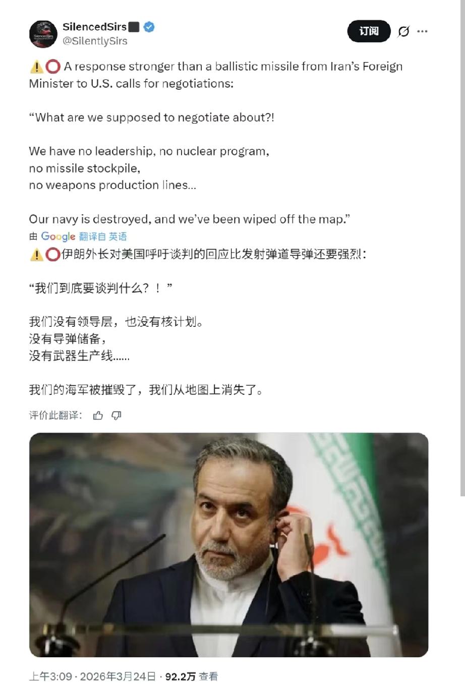 伊朗外长发火了,没走官网直接上了X。 他连问几个“还谈什么”,句句带血带灰,全是刚炸完的工厂、刚死掉的军官、刚断掉的海峡。 这事没录音没通稿,就几句话,可全世界都盯着看。 3月17号拉里贾尼被无人机打中,20号伊斯法罕地下指挥中心塌了,22号纳坦兹离心机停转,24号霍尔木兹没一艘商船敢过。 美军承认打了三处“离心机部件厂”,伊朗说核心还在转;南帕尔斯炼厂炸了,LNG出口掉四成,但他们当天就放出潜艇发射视频,说“不是没了,是藏好了”。 他不是求饶,是把伤疤扯开给人看。 对内稳住老百姓,对外堵住特朗普那句“伊朗已被击败”。 中方没劝他谈,只说先保人道通道和海峡安全——这比讲道理更实在。 阿拉格齐不发声明,只发X。 话不多,但每句都踩在刚冒烟的地面上。 发完就关了评论。 伊朗外长发火了,美国说赢了,海峡却没船了。