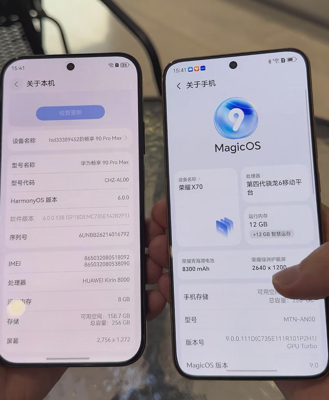 抛开品牌因素,荣耀X70和华为畅享90 Pro Max大家会选谁 两款产品定位相同,起售价都是1699元,估计不少人犯了愁。就我个人感觉,荣耀X70的外观设计更高级,辨识度更高 配置的话,荣耀X70的骁龙6Gen4与华为畅享90 Pro Max的麒麟8000是一个级别的芯片,拉不开明显的差距,而华为的优势在于8500mAh电池,但是荣耀X70的8300mAh电池配上了80W有线+80W无线的充电组合 还有荣耀X70正面是6000nit峰值亮度的绿洲护眼屏,拥有级别更高的IP68/IP69K防尘防水,以及双扬声器、X轴马达 不考虑品牌,你们会选择谁