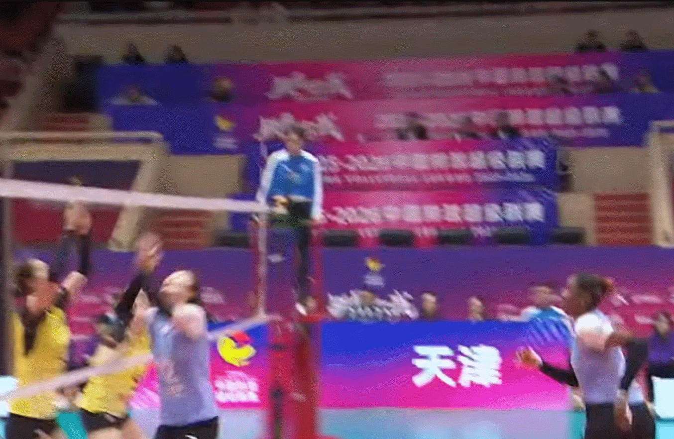 天津渤海银行女排排超联赛杨柳和孟豆抢网口球……