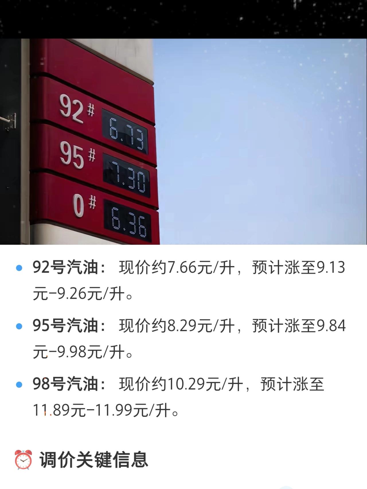 油价刚大涨完就掉头猛跌,接近9毛的涨幅还没捂热,4月7日新一轮调价窗口就要开,这波怕是要白忙活,到底是调还是不调? 目前92号汽油8.56元、95号9.11元、0号柴油8.23元,都冲到三年来新高了。 本来按测算该大涨2.2元,结果只涨了1.1元,实在让人看不懂。 这两天国际油价先跌后涨,目前调价周期里只跌了25元/吨,按规则得跌到50元才会正式调价。 也就是说这次要么小降一点,要么直接搁浅不调。万一中东再起冲突、OPEC再减产,油价分分钟又要反弹。 接下来八天走势直接关系到咱们钱包,现在加油也只能图个安心了。 4月4号晚上就会公布最终结果,你们是打算等降价再加,还是先加满再说?