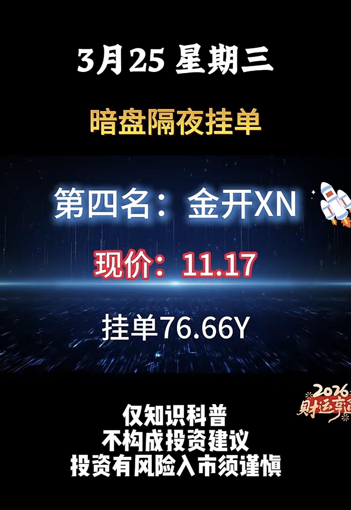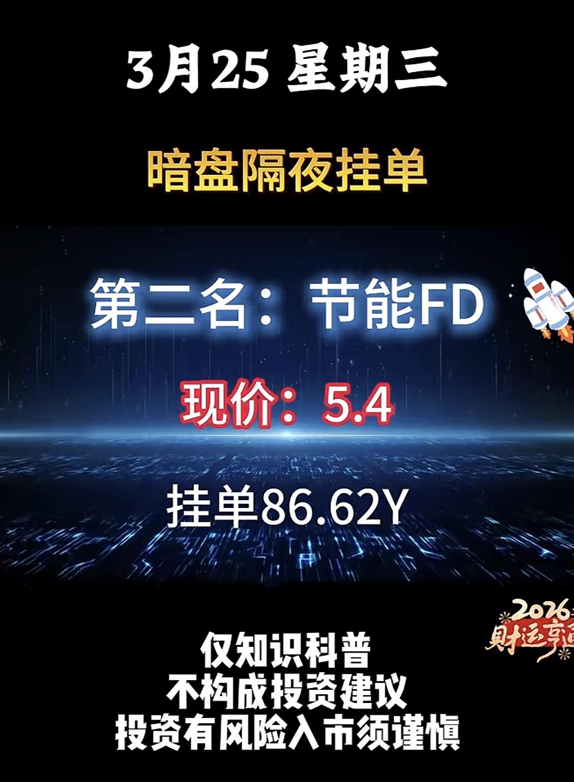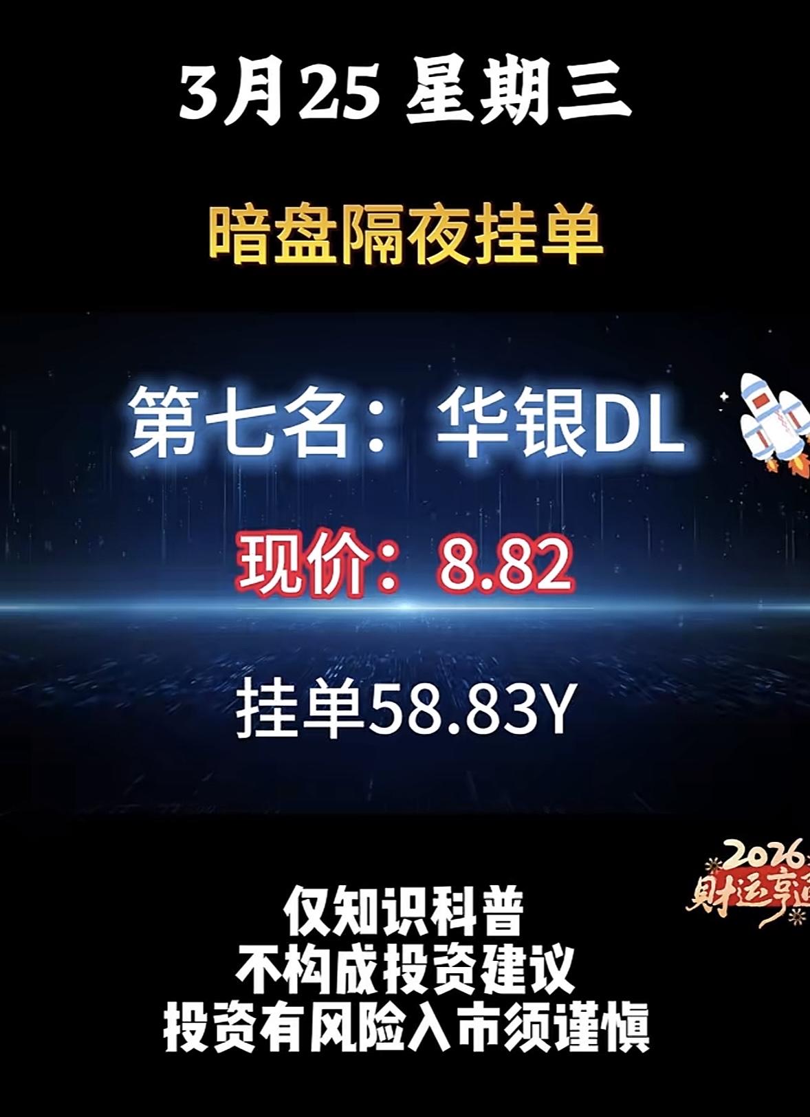 3月26日暗盘隔夜挂单排行榜揭晓 暗盘隔夜挂单这事儿,就像一场神秘的博弈。就拿华银电力来说,现价8.82,却有58.83亿的挂单,这数字看着就惊人。暗盘交易本身就充满不确定性,隔夜挂单更是在和未知的市场变化赛跑。也许有人觉得这是个机会,想着能在第二天大赚一笔,但市场哪有那么好预测。说不定第二天股价就像坐过山车,挂单的人可能就被“套牢”。所以啊,投资真得谨慎,别被这巨额挂单冲昏了头脑,毕竟钱可不是大风刮来的,得小心再小心。