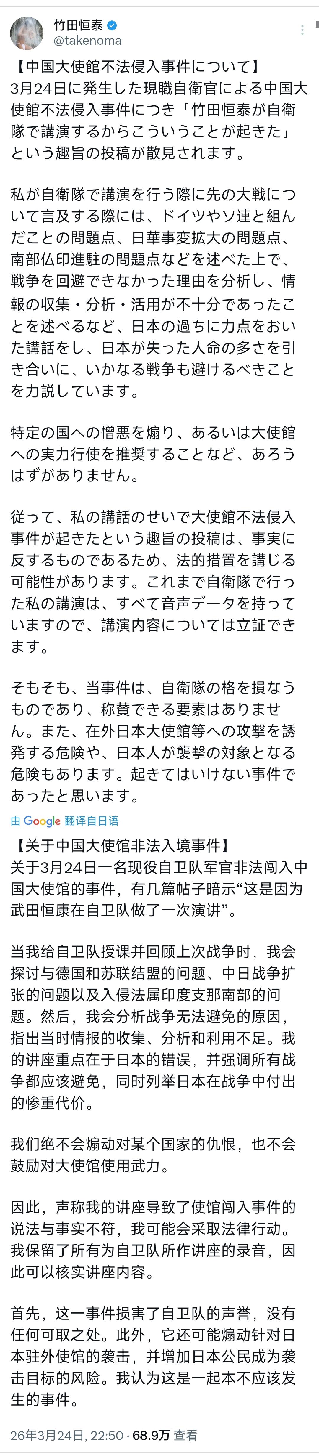 针对3月24日发生的现役自卫官非法闯入中国大使馆的事件,日本明治天皇的玄孙、极端右翼代表人士竹田恒泰昨晚发文急着撇清。 说白了,竹田恒泰紧急发声撇清与闯馆事件关联,表面是自证清白、反对极端行为,实则是怕引火烧身,试图掩盖右翼思潮在自卫队蔓延的事实。 要知道,3月24日晚,日本明治天皇玄孙、极端右翼代表竹田恒泰发文,否认自己的自卫队演讲煽动极端情绪,称从未鼓吹仇恨与武力,还表示要对造谣者采取法律手段,甚至斥责闯馆行为损害自卫队尊严。可他越是急于切割,活像做贼心虚,越让人怀疑背后的问题。 可这绝非单纯的名誉维权,而是右翼分子的危机公关。闯馆事件发酵后,舆论直指自卫队受右翼思想洗脑,而竹田常年在自卫队演讲,自然被推上风口浪尖。他急忙拿出录音自证,就是怕牵连自己,更怕右翼势力被彻底清查。 其实,他口中“反思战争、反对仇恨”的说辞,根本站不住脚。作为极端右翼代表,他一贯美化侵略历史、渲染外部威胁,即便演讲表面不提仇恨,也在潜移默化灌输极端思想。这种嘴上反战、骨子里排外的做派。 殊不知,竹田越是撇清,越说明事件背后有右翼思想土壤。一名年轻自卫官敢持刀闯外国使馆,绝非一时冲动,而是长期受极端思想熏陶的结果。竹田想独善其身,根本不可能。 更要警惕,他斥责事件风险,并非真正维护外交秩序,而是怕连累日本海外机构与国民安全,完全出于利己考量,并非真心反思。 要清楚,历史总是相似。当年日本军国主义泛滥时,右翼分子同样一边煽动狂热,一边在事发后推卸责任,从不承认思想毒害的恶果。如今竹田的操作,正是历史重演。 而未来,照这个趋势下去,竹田大概率会借助法律手段打压舆论,继续在自卫队开展右翼演讲。日本政府也会以个人行为结案,放任右翼思想渗透。中方会持续关注事件背后的思想根源,若日方不彻底整治,类似极端事件只会再次发生。 说到底,竹田恒泰的紧急撇清,本质是右翼势力的自保行为。闯馆事件的根源,正是他这类人长期灌输极端思想所致,再怎么辩解,也掩盖不了极右翼危害日本与地区安全的事实。 以上是小编个人看法,如果您也认同,麻烦点赞支持!有更好的见解也欢迎在评论区留言,方便大家一同探讨。