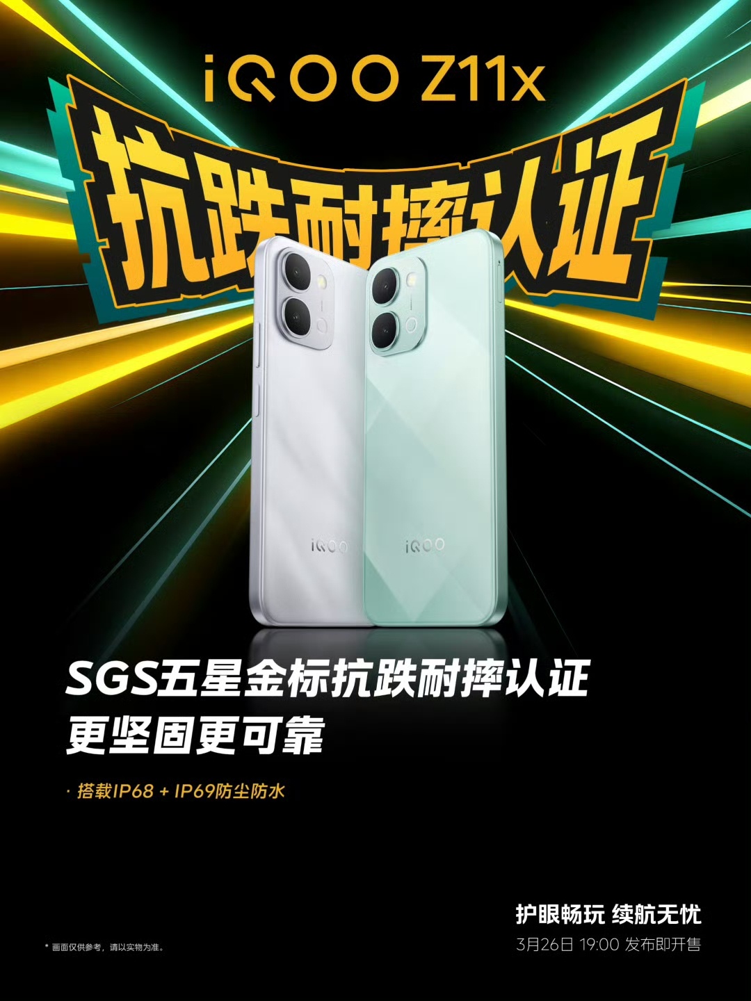 iQOO Z11 系列官宣将在 3 月 26 日发布即开售。据介绍,iQOO Z11x 手机将搭载天玑 7400 处理器 + 6.76 英寸 LCD 莱茵护眼屏,并内置 7200mAh 蓝海电池。