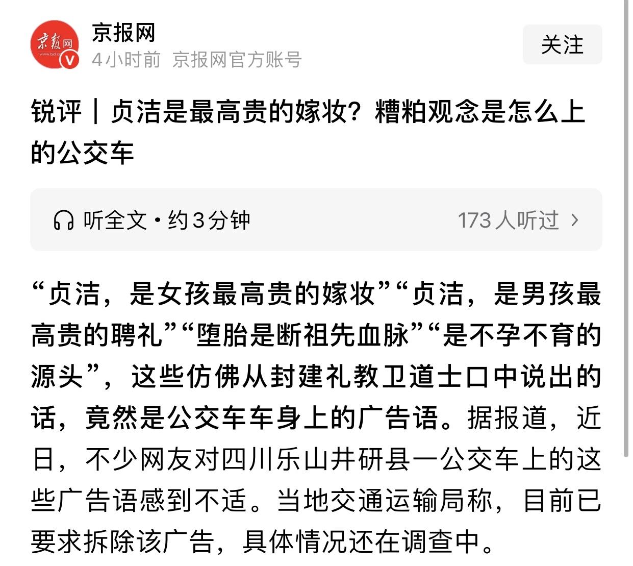 四川乐山公交车上贴了几句大实话,主要内容就是男女要洁身自好,要尊重传宗接代的传统,京报网作为主流媒体直接用“腐朽愚昧”定性未免有点太着急,不知道是哪位女编辑这么生气,完全抛弃了客观立场更无视一大部分普通人的对这几句话的理解,用“糟粕观念”全盘否定,好在评论区说出了真相:满满的正能量!