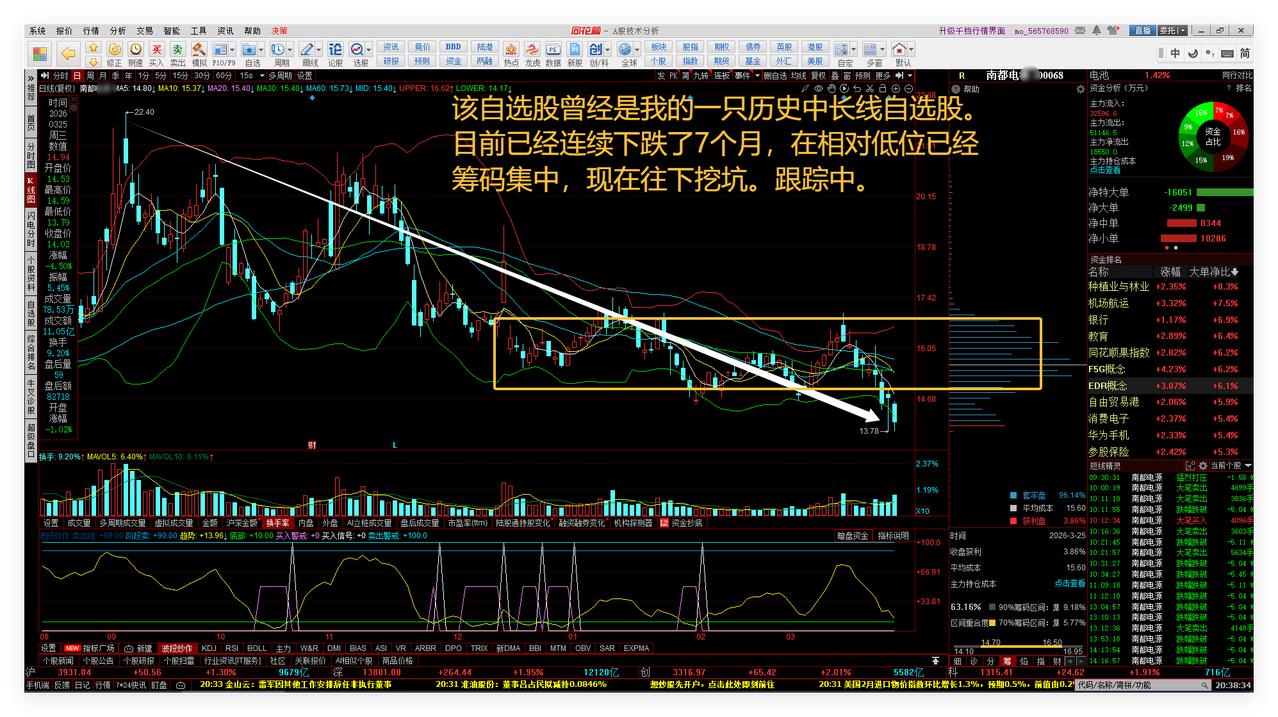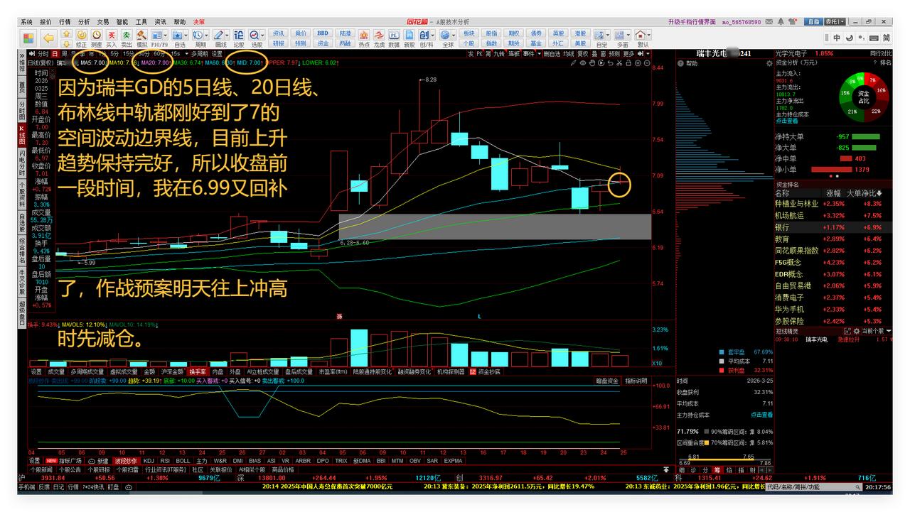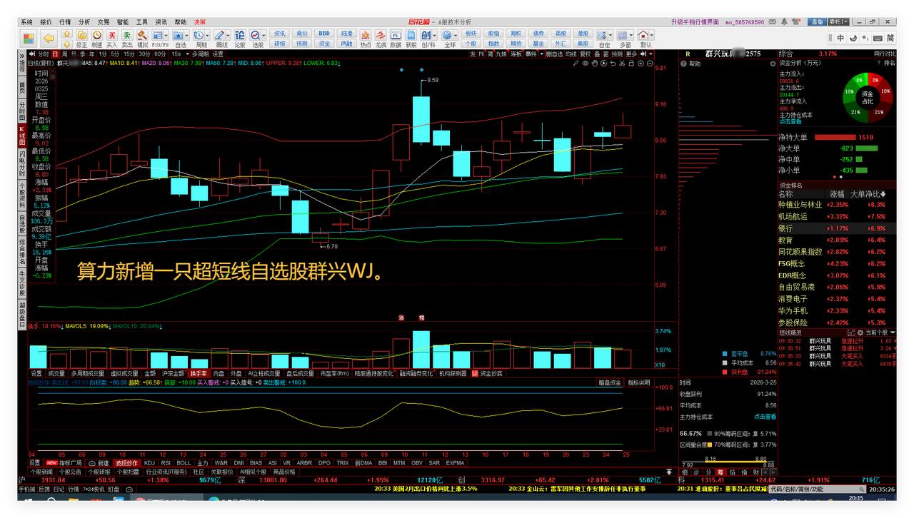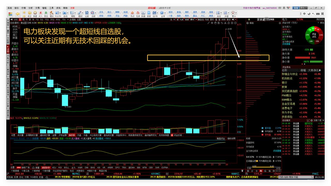 明天是短线变盘时点,我就今天撤出了。今天中午和晚上复盘心得:围绕国家算电协同发展战略寻找机会。 1、明天是短线变盘时点,我就今天撤出了。 大盘超短线因为获利盘较多,需要震荡和技术回踩一下,比如富时A50期指连续,明天有可能是阴线。因为我喜欢主动出击和撤出,不喜欢被动挨打。敬请参阅附图1。 2、收盘前一段时间,我在6.99又回补了瑞丰GD。 因为瑞丰GD的5日线、20日线、布林线中轨都刚好到了7的空间波动边界线,目前上升趋势保持完好,所以收盘前一段时间,我在6.99又回补了,作战预案明天往上冲高时先行减仓。敬请参阅附图2。 3、围绕国家算电协同发展战略寻找机会。 中午复盘了电力板块所有个股,发现许多已经涨得太高了。 电力板块发现一个超短线自选股,可以关注近期有无技术回踩的机会。敬请参阅附图3。 算力新增一只超短线自选股群兴WJ。敬请参阅附图4。 4、在下跌股票中寻找未来有可能上涨的机会。 该自选股曾经是我的一只历史中长线自选股。目前已经连续下跌了7个月,在相对低位已经筹码集中,现在往下挖坑。跟踪中。关注9月底4月初的机会。敬请参阅附图5。 该自选股和南都一样,也是晚上选出。有资产重组预案。今天最大跌幅接近20%。跟踪关注后市有没有跌到9.40上下的超跌反弹机会。敬请参阅附图6。 本文是我的股道修行日记。 老铁们下期再见点赞发财。