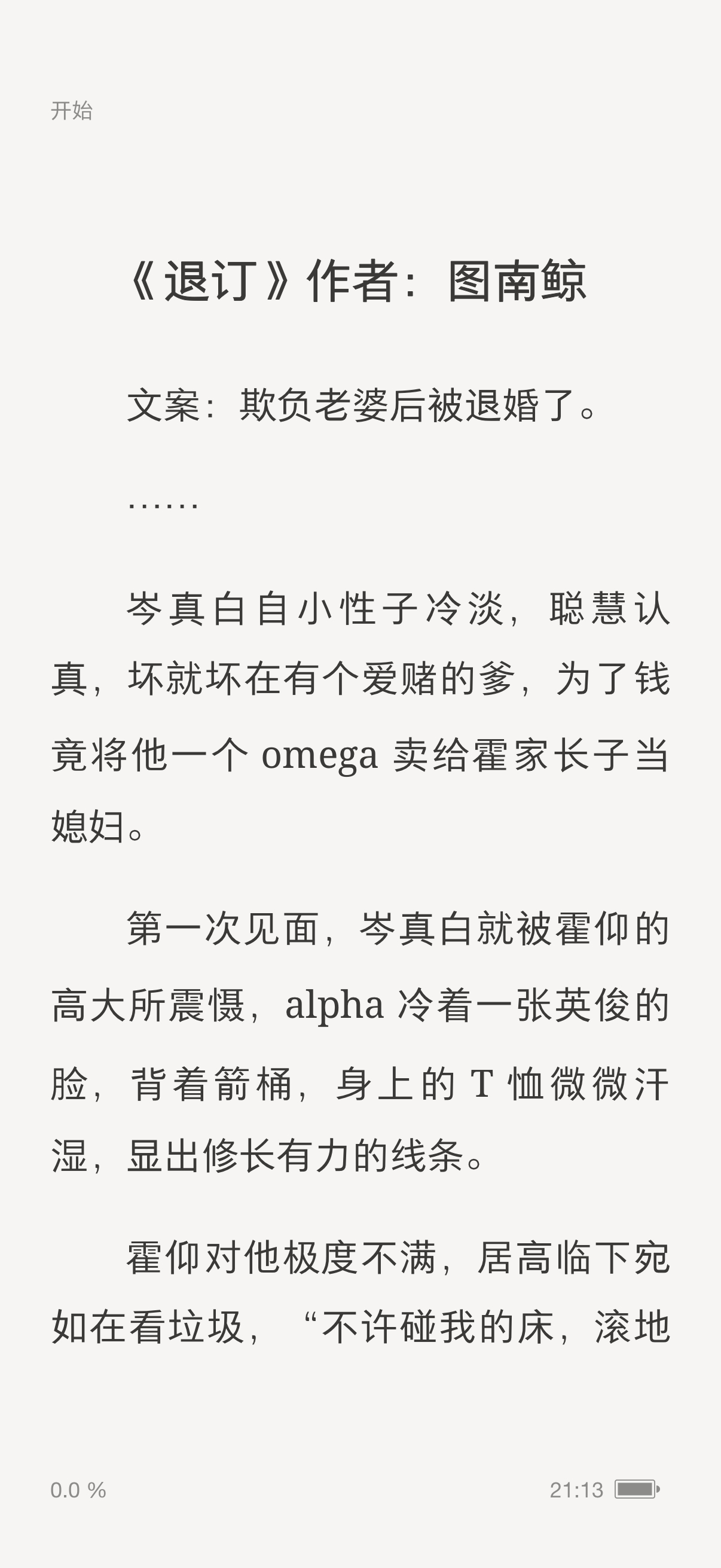 发现好看的abo设定了,《退订》by图南鲸,文笔特别特别特别好!!!先婚后爱,破镜重圆,追妻火葬场,又强又乖又冷淡又自立的Omega,攻对受一开始怀着满满的误会和恶意,我现在就等这个煞笔alpha追妻火葬场