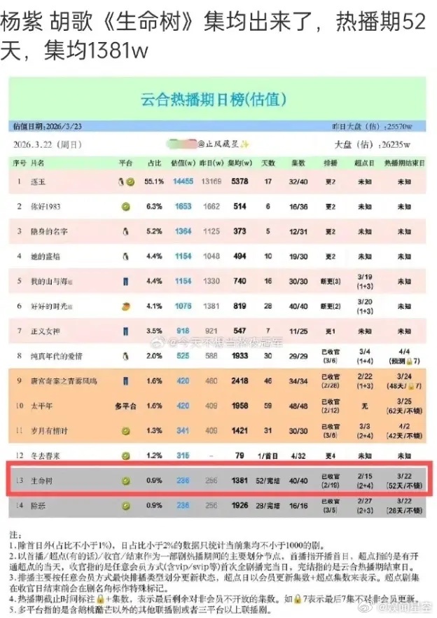 杨紫《生命树》集均1381万!《生命树》热播期52天结束,最终云合集均1381万,不过还好,正午阳光播放量最差的一部还是张新成的《淬火年代》,一部剧云合低并不影响演员的资源,杨紫这两年最大问题不是云合,而是她的剧只要上星收视率就很低,现在被打上了砸穿收视底盘的标签,其他方面有劣势好补救,收视率不行很难补救,这次甚至连这么大制作大营销的央视剧的收视也是倒数,她这个标签短时间内很难改观了,谭松韵则相反,每次网播量一般,但收视率都很不错。