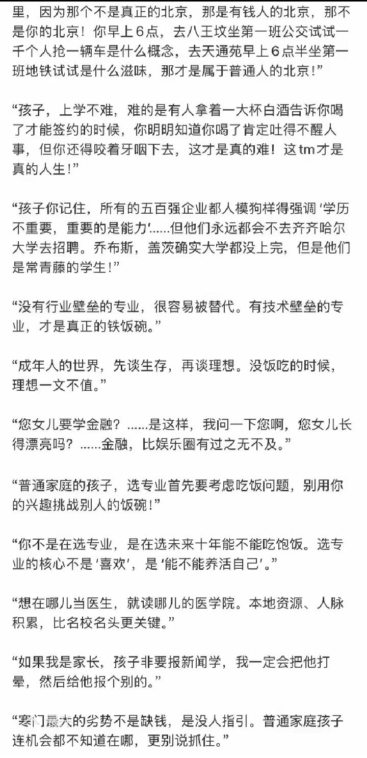 张雪峰的语录扎心又现实,很值得收藏。👇句句经典,句句都是大实话,很好理解,也都很现实,讲的很通透! 📚 升学·志愿(最戳普通人) - 家里没矿别谈理想,学习是老实人家孩子唯一的出路 - 七分考,三分报,报志愿就是报未来,报人生 - 学历不是万能的,但没有学历,很多门你都进不去 - 不要用兴趣绑架前途,兴趣不能当饭吃时,先吃饱再说 - 普通人家,求稳就是赢 💪 现实·努力(最清醒) - 世界很现实,你弱的时候坏人最多 - 没有伞的孩子,必须努力奔跑 - 成年人的世界,钱是底气,是尊严 - 社会不看眼泪,只看实力 - 与其抱怨黑暗,不如提灯前行 - 熬得住出众,熬不住出局 ❤️ 人生·温情(最动人) - 不要当父母需要你的时候,除了泪水一无所有;不要当孩子需要你的时候,除了惭愧一无所有 - 人活着,就是为了体验那些你没有体验过的美好 - 学会和自己和解,人生不是非要争第一 - 我希望可以成为一代人的回忆,能帮到大家,比挣多少钱都重要