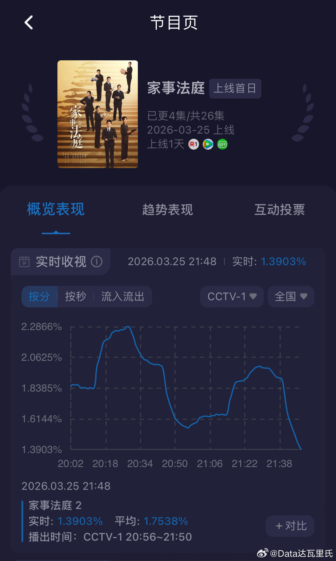 《家事法庭》首播酷云收视率:第1集峰值2.2866%,看走势第2集明显降了…不妙啊……换观众ing老规矩看3天~