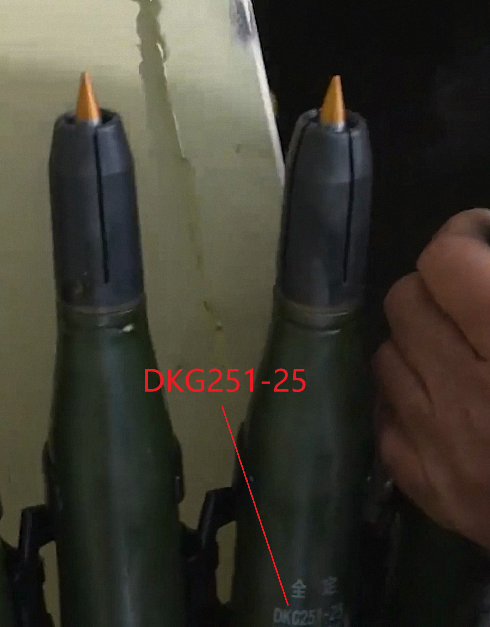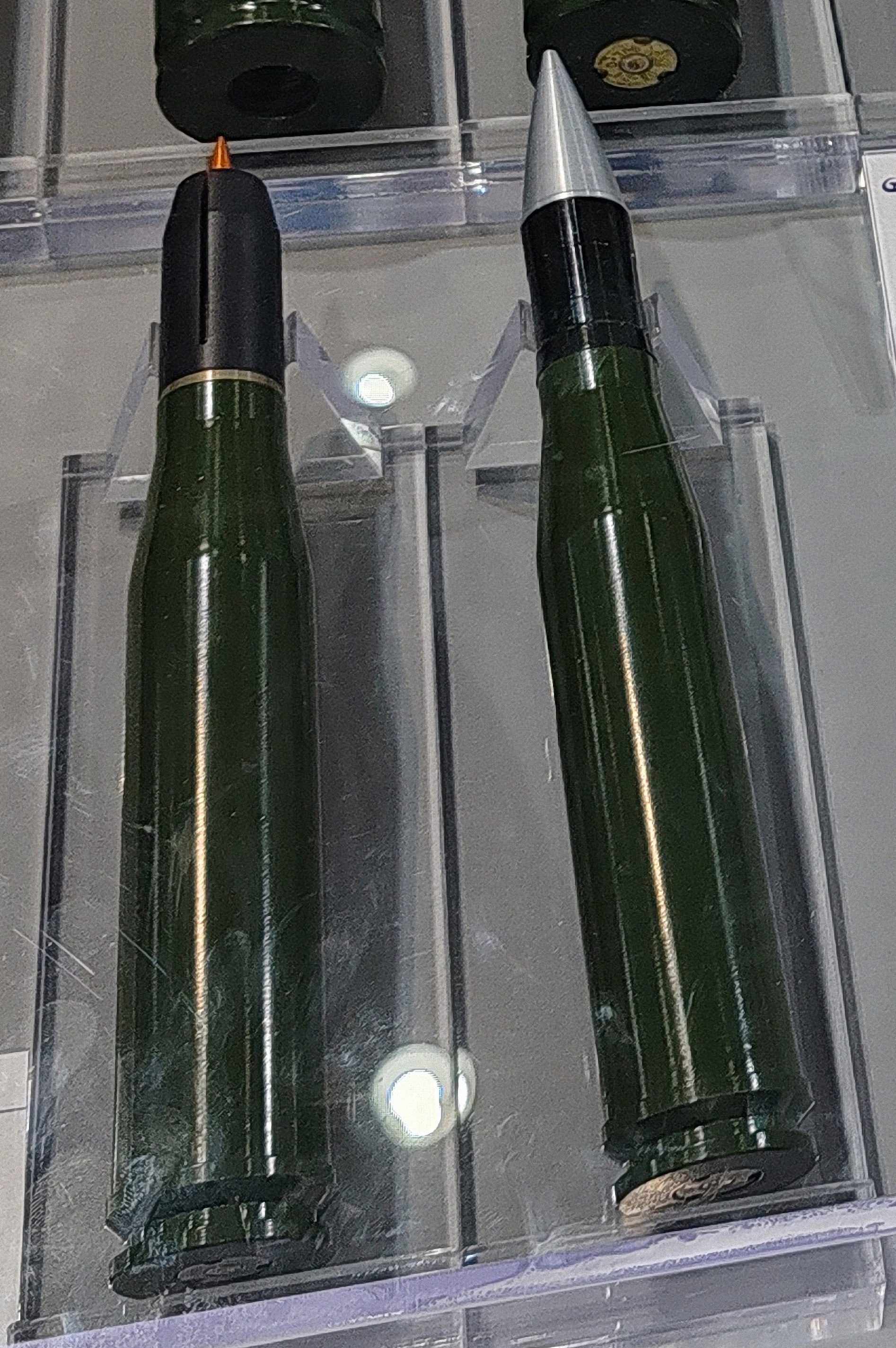 珠海航展展出的25mm APDS,左边的大概率是625的DKG251-25,金色弹尖,右边的是老式风帽穿甲弹DKC-25曳光穿甲燃烧弹