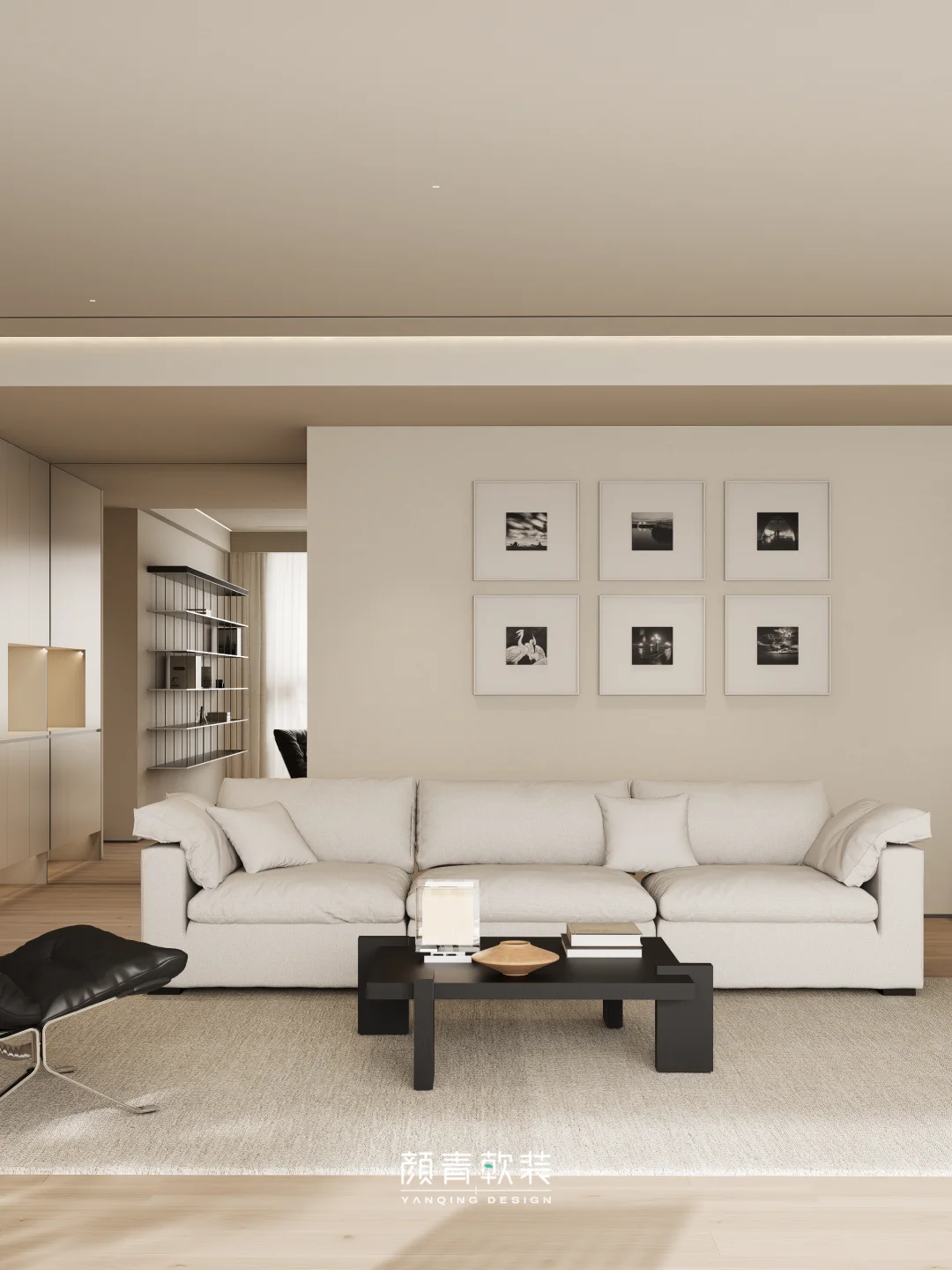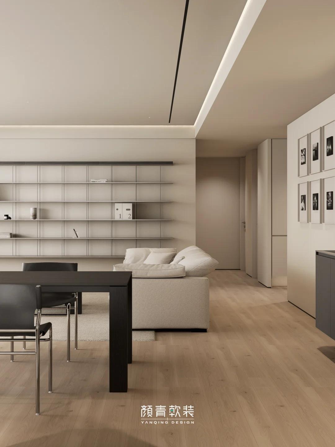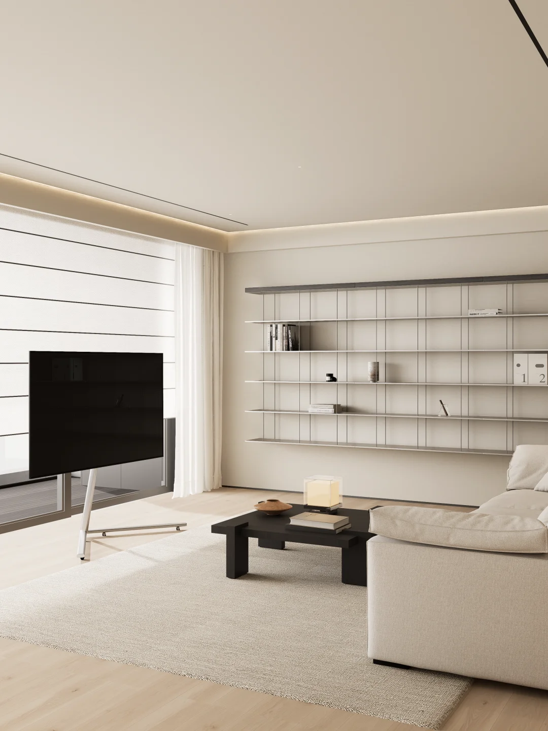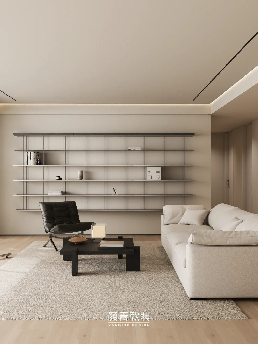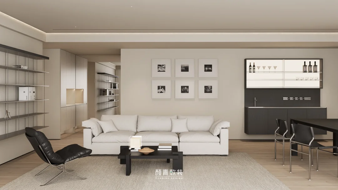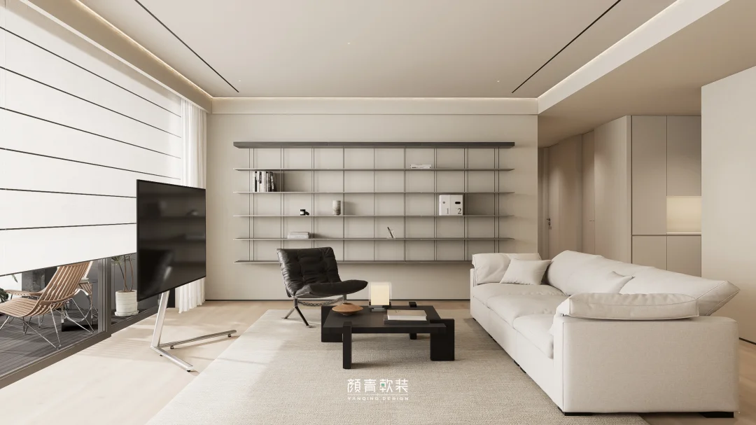 整面悬浮钢板置物架替代了厚重柜体,让客厅视觉瞬间清爽