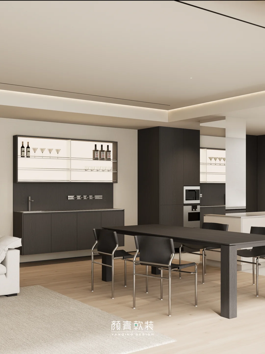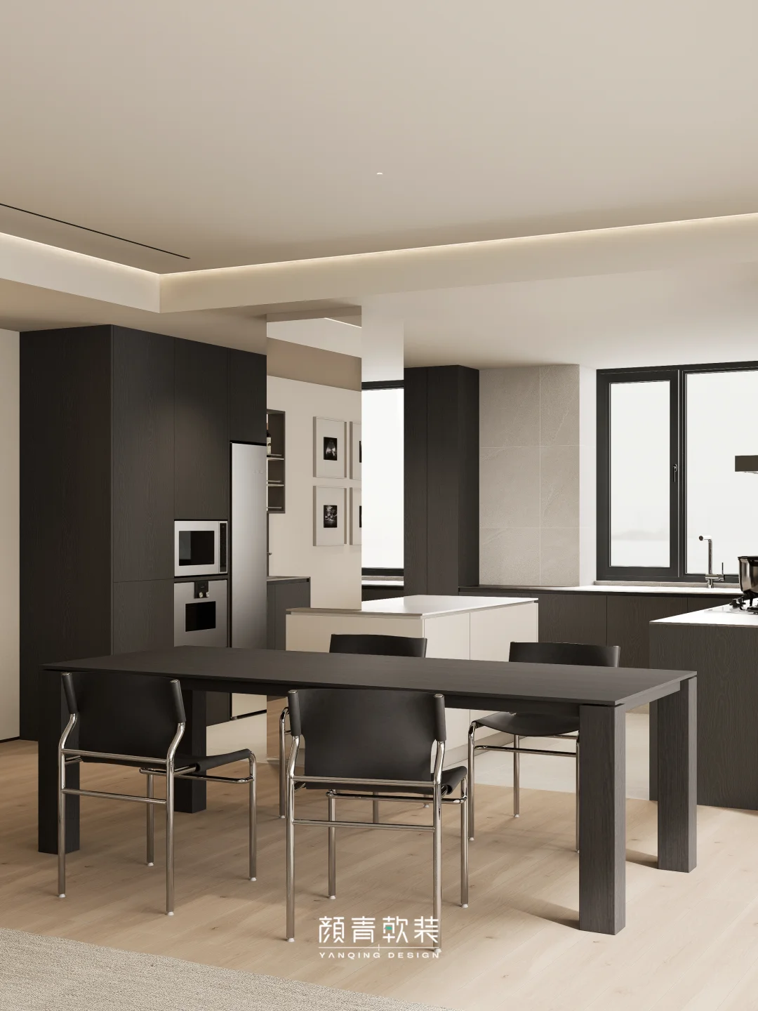 打通的客餐厨动线,黑调中岛餐台与浅色系空间形成温柔撞色