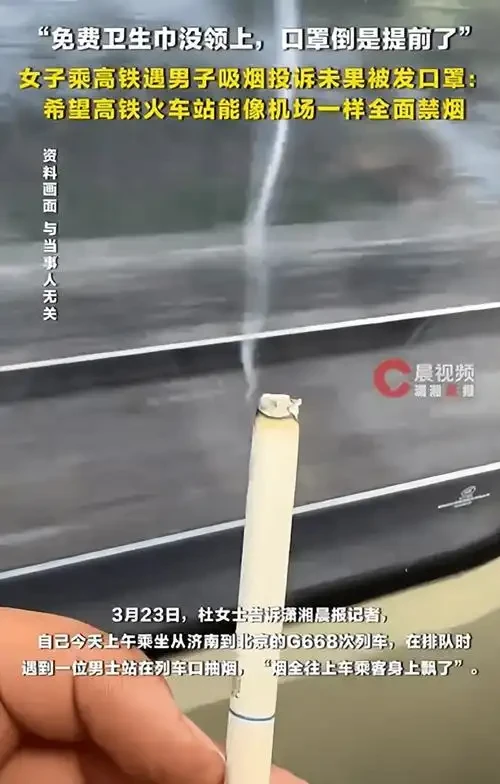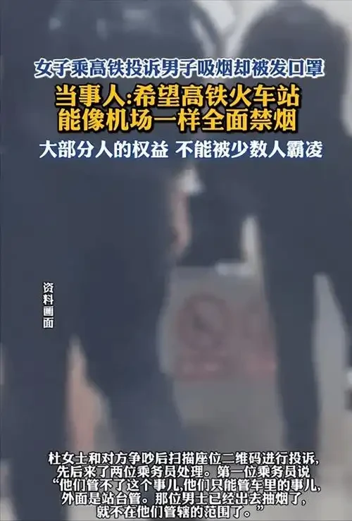 (细节钩子) “你知道吗?杜女士的经历,其实揭露了高铁控烟的一个致命bug!” 杜女士后来在网上吐槽:“明明是维护公共权益,却感觉被‘霸凌’了。”她的遭遇迅速引发网友热议: 有人支持杜女士:“高铁站台上到处是禁烟标识,那个男子明明违规了,凭什么没人管?” 有人讽刺乘务员的处理方式:“这就像被人打了,对方递给你一块创可贴,说‘你贴上就不疼了’!” 还有人爆料类似经历:“上次我在动车卫生间门口看到有人抽烟,乘务员也只是劝他掐了,连句批评都没有。”