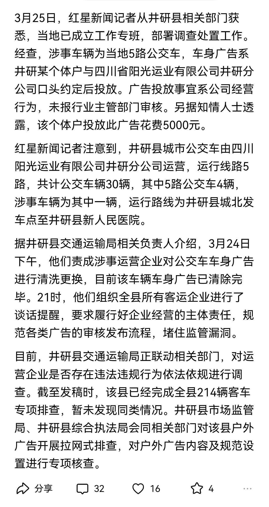 四川乐山公交车“广告争议”的事,当地竟然成立了“专班”进行处置[抠鼻]原来只是“个体户投放广告”,已经“清洗完毕”,算是息事宁人…[思考]我就纳闷儿了,到底什么人“感到不适”呢? “白左”那种专给“妖魔鬼怪”搞“平权”的套路,有人正在试图向中国“移植”,这才是应当警惕的[发怒]