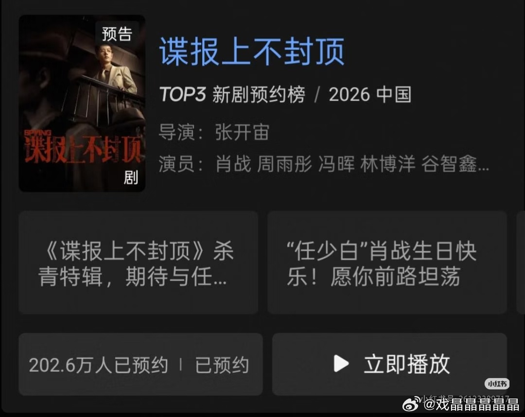 《谍报上不封顶》的预告片一经发布,展现出主流官媒的顶级行业排面,覆盖政治、文化、地域多圈层,奠定"国民级剧集"基调。反映出制作方对剧集品质的绝对信心与市场预期,说明了观众对肖战的认可与期待。 肖战谍报上不封顶