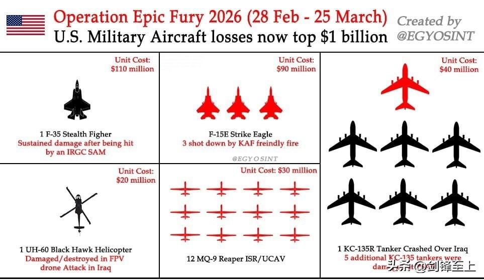 这是美军开战近一个月以来的损失统计,大家欣赏一下 –1架F-35(防空导弹打击/受伤退役) -12架MQ-9收割者无人机(击落) –3架F-15E战斗机(友军火力/击落) –1架KC-135加油机(击落/空中事故) –6辆KC-135加油机(导弹撞击/地面损坏) –1架UH-60黑鹰直升机(抵抗力量FPV打击) 北约轰炸南联盟78天也没损失几架飞机,打伊朗不到一个月,几十架飞机直接没了 伊朗作为一个有自主军工业能力,有悠久历史,有抵抗意志的国家,不是美国光靠空袭可以轻易征服的 美国现在最好的收场方式就是出让中东部分利益,彻底放弃进攻伊朗 否则再打下去,不光中东霸权不保,其他地方肯定也会后院起火