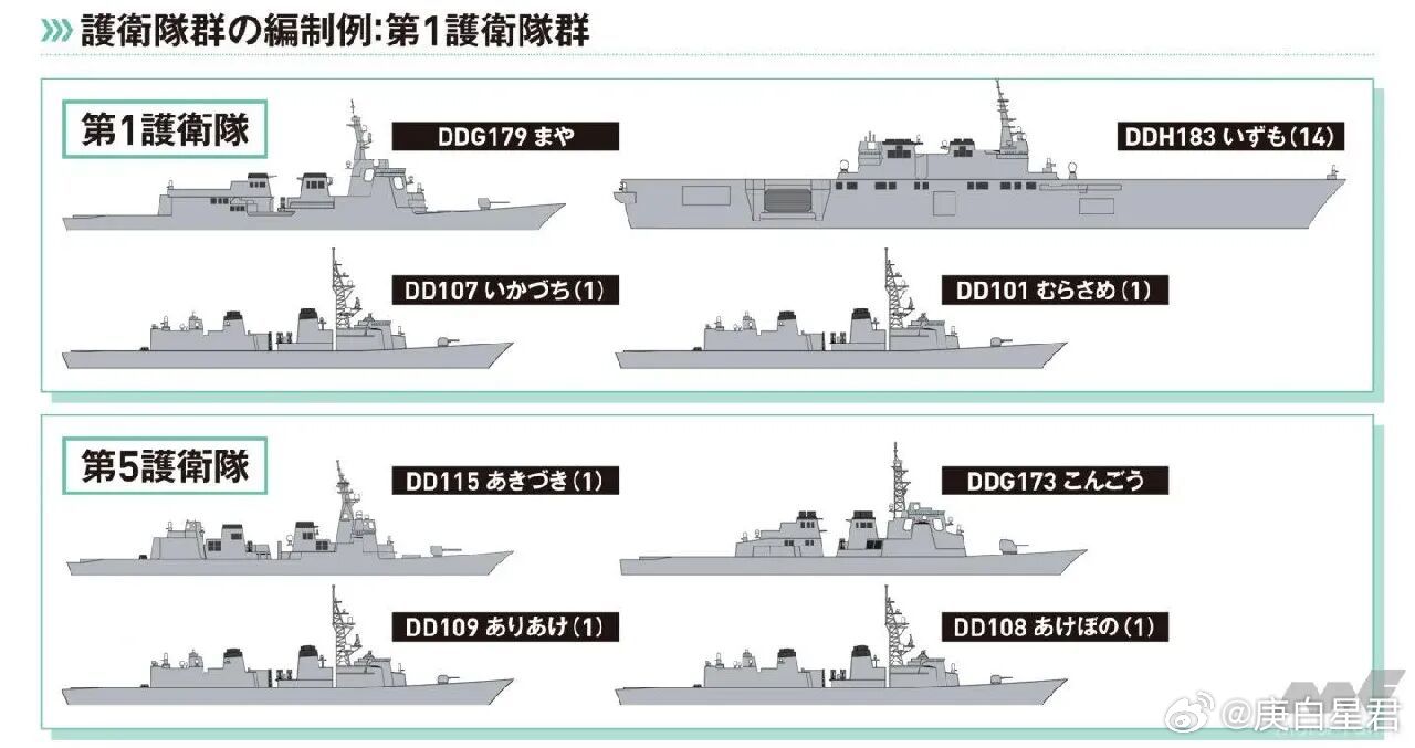 此前隶属于第11至第15护卫队的最上级护卫舰被分配至该群,而已经下水的新型警戒舰1号舰“樱”号、2号舰“橘”号、3号舰“桧”号、4号舰“杉”号在服役后也计划部署于此。新设立的信息作战集团整合了此前分散的情报、网络、通信与海洋观测功能。该集团不直接指挥舰艇与飞机,但作为指挥、控制、通信、计算机、情报、监视、侦察的核心支持快速决策。