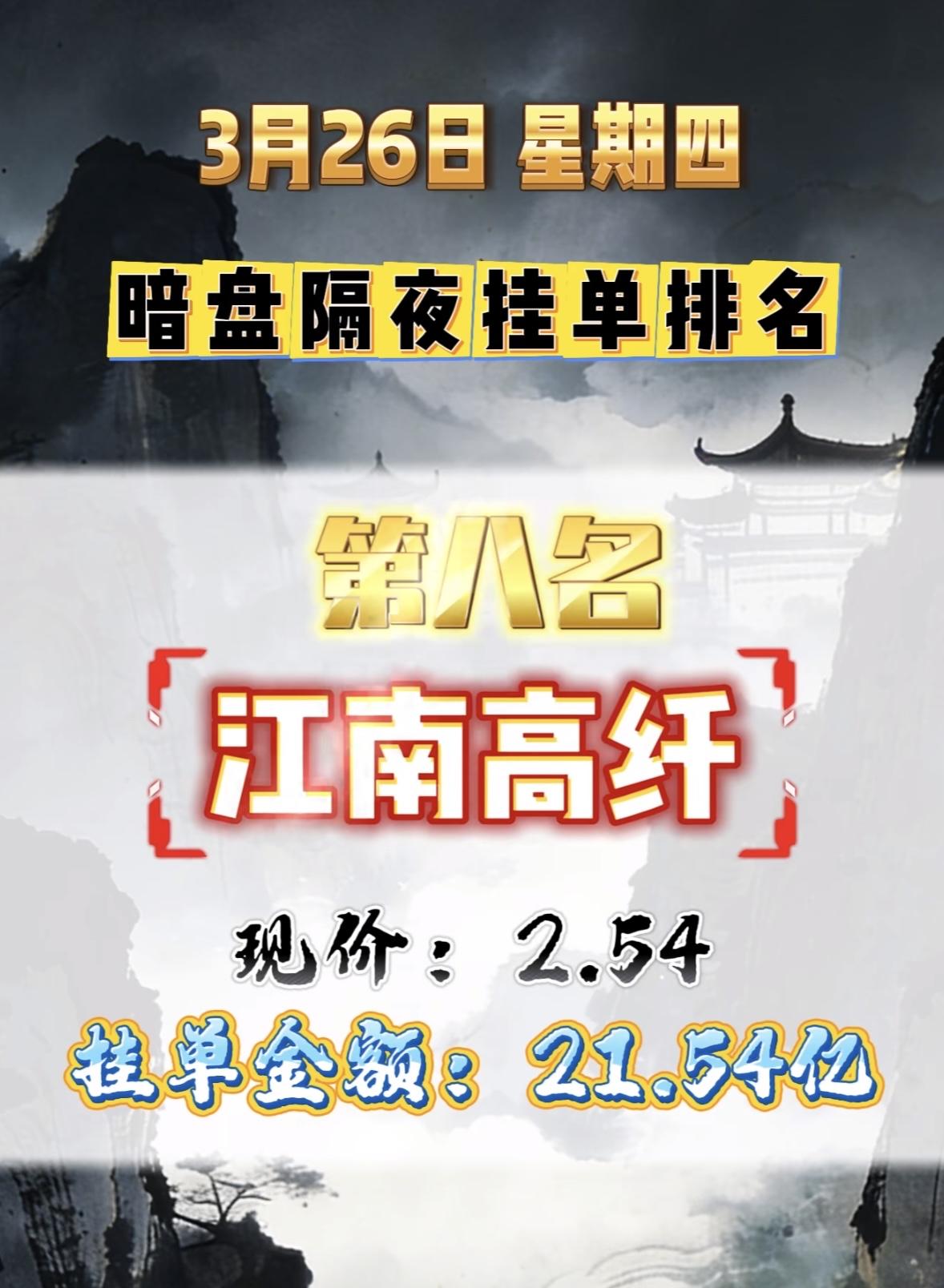 3月26日暗盘隔夜挂单排行榜出炉 江南高纤排第八名,现价2.54,挂单金额达21.54亿,这数据挺惊人。江南高纤曾有过更名情况,2003 - 11 - 27叫江南高纤,2005 - 11 - 03变成G高纤,2006 - 10 - 09又变回江南高纤。对比3月23日暗盘流入挂单排名靠前的个股,像协鑫集成流入10.5亿、粤电力A流入2.8亿等,江南高纤这次挂单金额这么高,不知道后续走势会怎样,是会像其他热门股那样因资金涌入而有好表现,还是另有变数,值得持续关注。