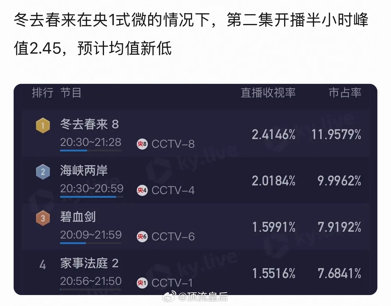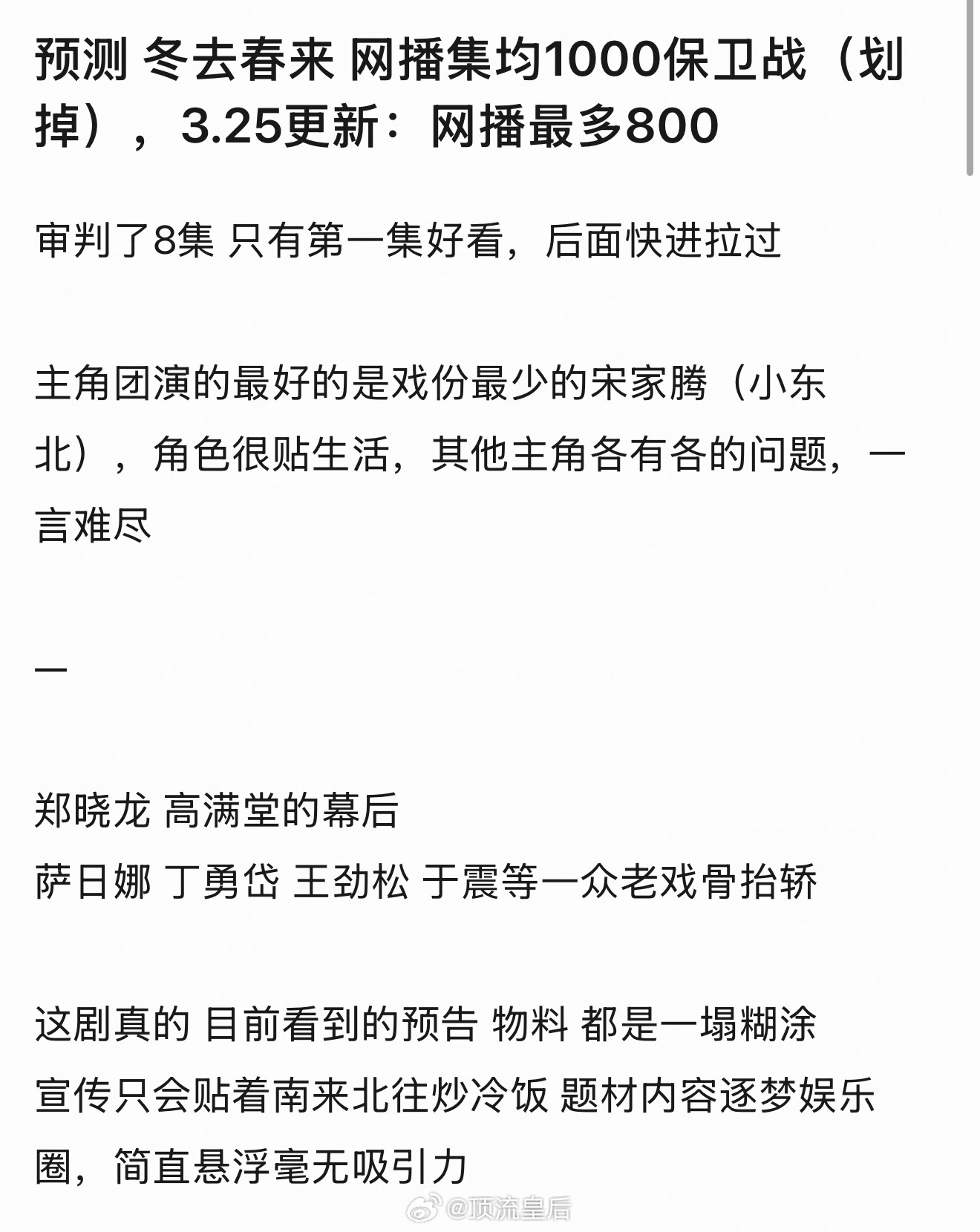冬去春来不仅线下收视低迷,线上网播持续走低,剧情也被吐槽悬浮,全靠南来北往同班底引流,但样样都不如南来北往。这下连口碑都保不住了,完全血扑。