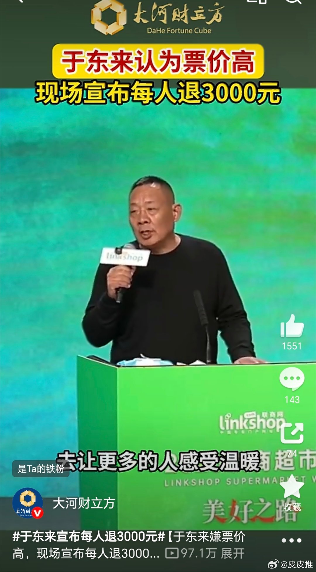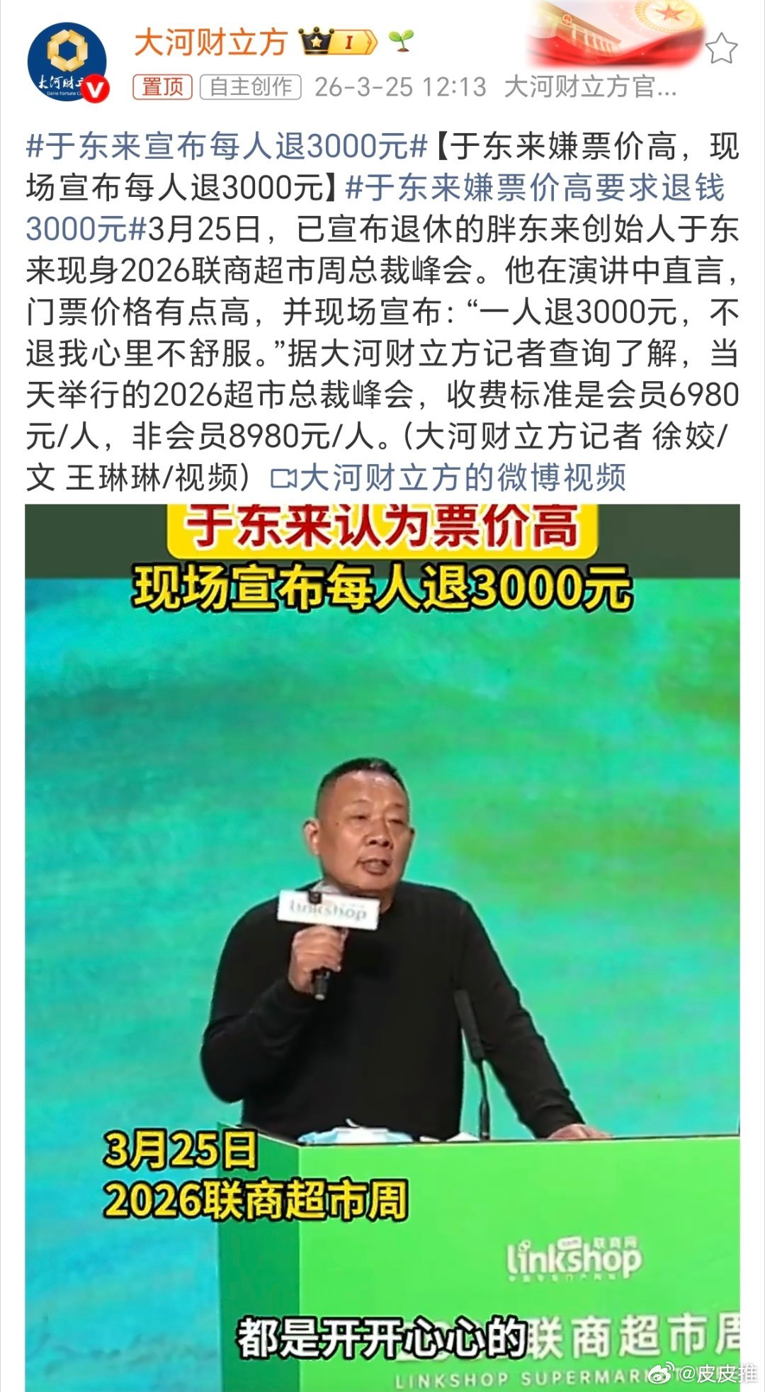 于东来宣布每人退3000元这个活动是联商网主办的,钱也不是于东来一个收的,看图3收款账户就能看明白。