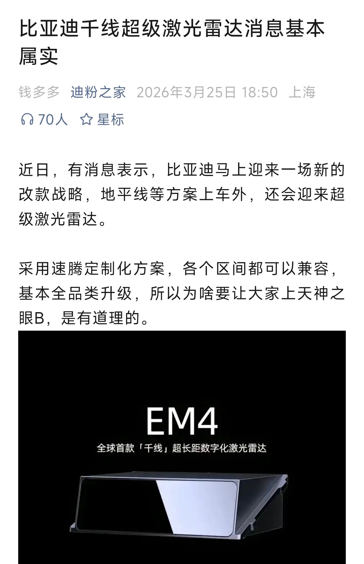现在传出消息比亚迪疑似要上千线激光雷达了,虽然八字没一撇,没有任何官方证据,但是他们立刻理性了,知道“固然硬件重要,但是......”了