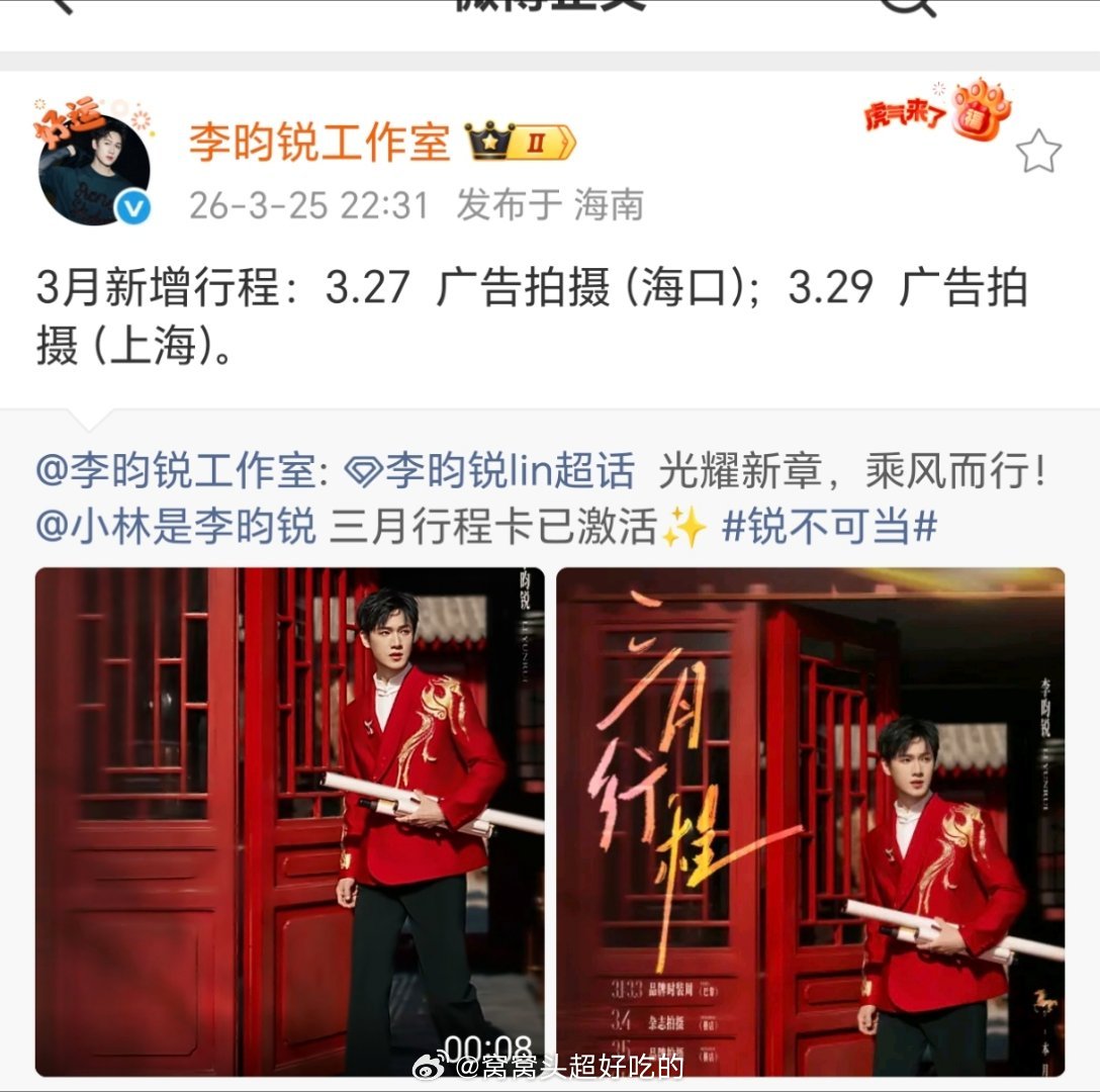 李昀锐3月又新增两个广告拍摄,今天还官宣了常驻奔跑吧,冰湖重生招商备播,小森林10万座云包场也为诸葛玥准备好了,粉小林就是爽。