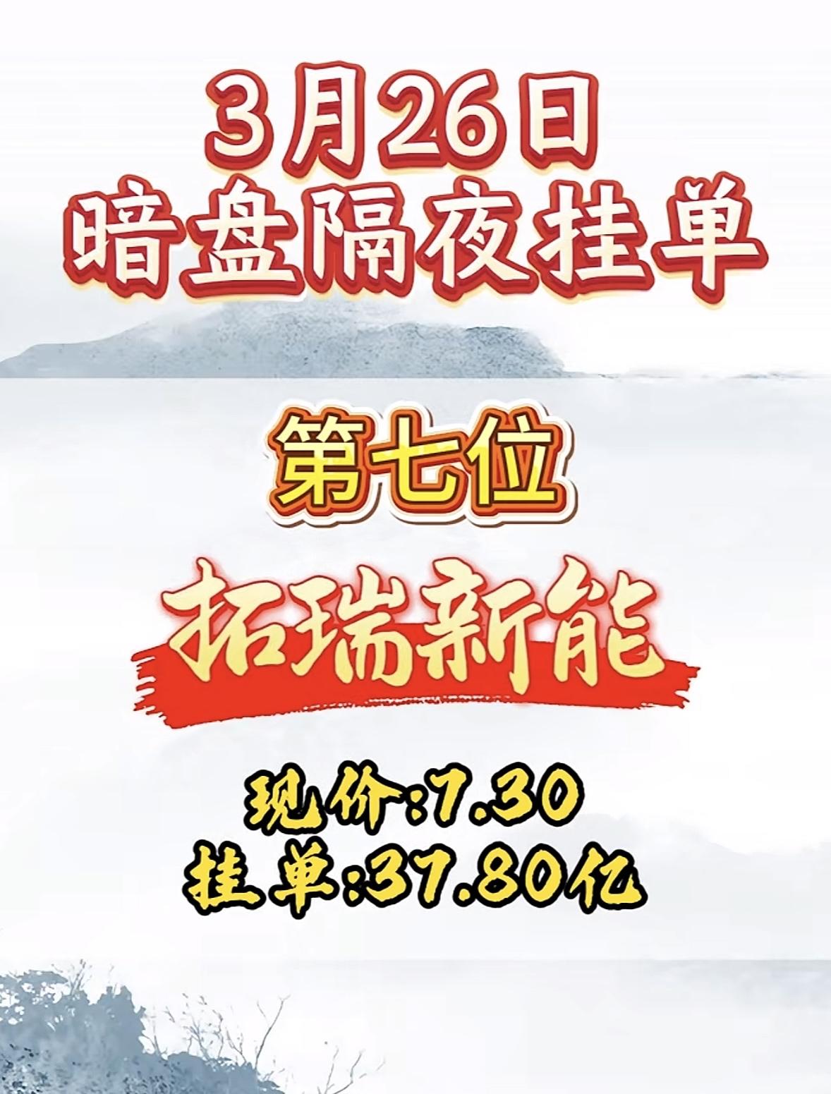 3月26日暗盘隔夜挂单排行榜揭晓 拓瑞新能源排第七,现价7.30,挂单37.80亿,这数据挺吸睛。之前3月2日的隔夜暗盘挂单,第一名洲际油气挂单94.55亿,和拓瑞新能源差距不小。新能源板块在暗盘隔夜挂单里一直表现亮眼,像3月25日协鑫集成以挂单48.44亿拿下新能源板块第一。拓瑞新能源能在众多企业中排第七,或许有它独特的投资价值。不过炒股不能只看挂单,还得看看是否有大股东减持、融资融券等情况,毕竟只有不到10%的股票有资金推动上涨,找对龙头和主线才是关键。