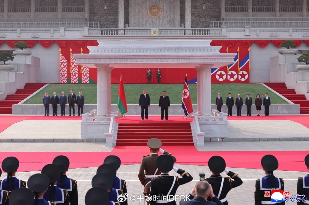 欢迎仪式场所立有朝鲜民主主义人民共和国国旗和白俄罗斯共和国国旗,朝鲜人民军仪仗队、骑兵仪仗队和国防省中央军乐团整齐列队。