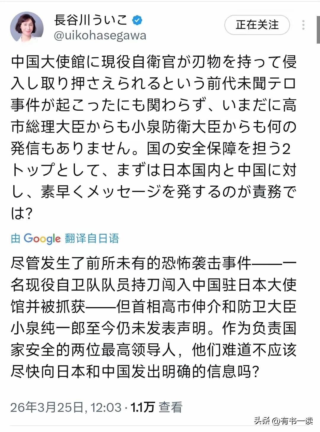 日本左翼怒批!自卫官闯我使馆,高市早苗集体失声太讽刺 就在昨天(3月25日),日本政界左翼代表长谷川羽衣子发出灵魂拷问:一名现役自卫官携带武器闯入中国大使馆,这简直是战后外交史上最严重的“安全危机”之一。可面对如此恶性事件,日本首相高市早苗和防卫大臣小泉进次郎竟然全程“装聋作哑”,既不对中国致歉,也不向国民交代。 这不仅仅是失职,简直是拿外交安全与国家责任当儿戏! 咱们来捋一捋这事儿有多离谱。肇事者村田见大,23岁的陆上自卫队三等陆尉,带着18厘米长的刀翻墙闯馆,还扬言要以“神的名义”杀害中国外交人员。这哪里是普通的治安案件? 别忘了,就在前不久,高市早苗还大放厥词说“台湾有事就是日本有事”,把中日关系搞得冰点。现在自家军官闯了大祸,高层却集体玩失踪,只靠内阁官房长官一句轻飘飘的“深感遗憾”就想蒙混过关? 这不禁让人想起当年的“二二六事件”,年轻的军官因为极端思想发动政变,最终将日本拖入战争深渊。今天的村田见大,虽然只是个案,但背后折射出的极右翼思潮泛滥和自卫队管理失控,难道不值得警惕吗? 长谷川羽衣子的质问一针见血:作为国家安全的最高负责人,沉默就是纵容!如果连本国军人的疯狂行径都管不住,日本还有什么资格谈什么“大国责任”?这种双重标准,只会让日本在右倾化的道路上越滑越远,最终掉进自己挖的坑里。 对此,我们不仅要问:高市早苗和小泉进次郎,你们还要装睡到什么时候? 中日关系 大国博弈