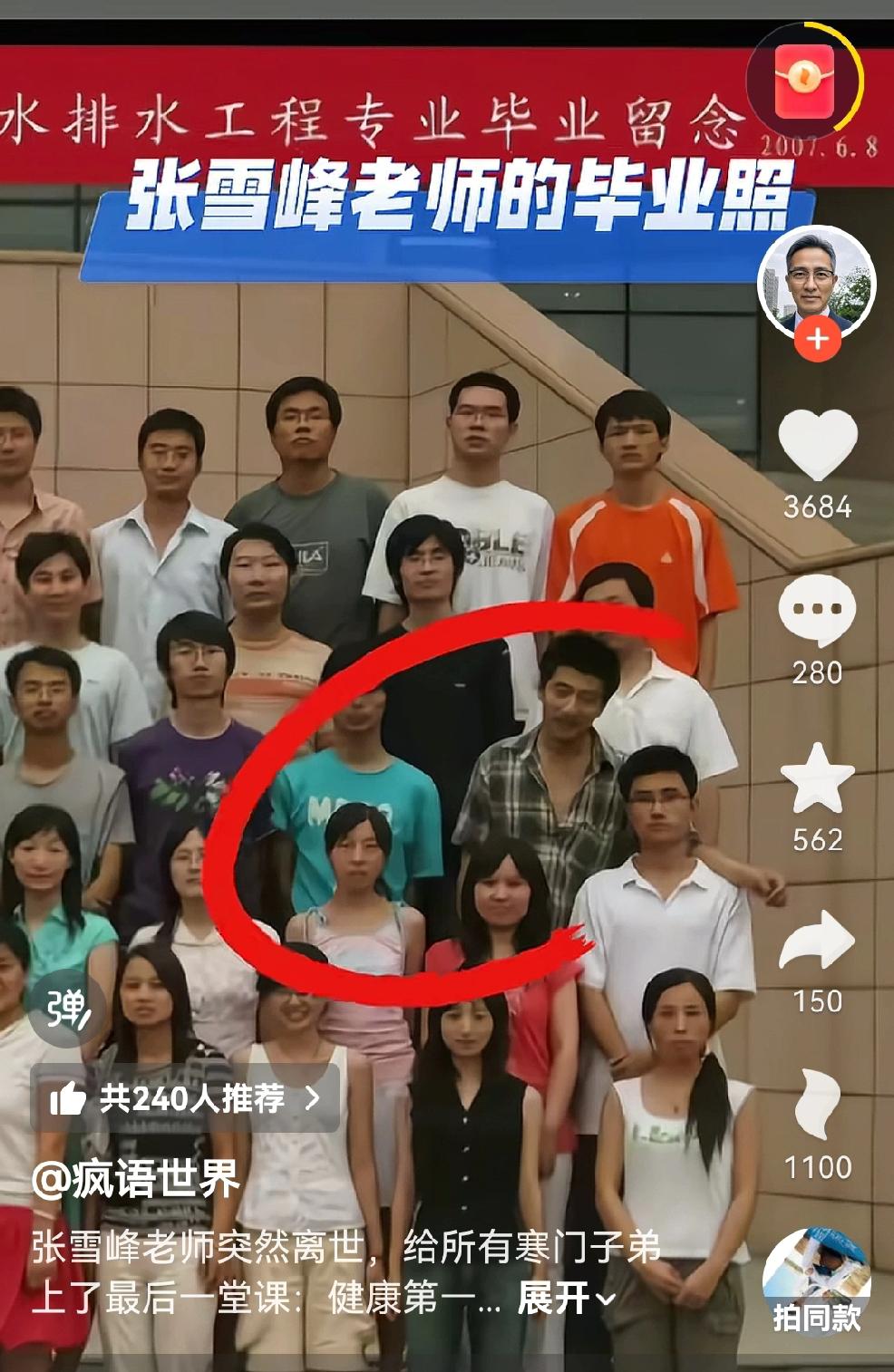 张雪峰老师2007年毕业于郑州大学给排水专业,2016年因为一个视频爆红全网。 此后多年,张雪峰老师一直是网红里面的顶流,还参加过许多综艺节目,在许多电视节目里面金句频出。比如某个小企业家说自己公司没有一个985211毕业生,张老师立马回复:所以你们企业并不是世界五百强!该企业家立马呆若木鸡无言以对! 那时候的张雪峰老师可谓春风得意,但凡他的同学亲戚朋友,只要有机会都会贴上去,逢人必说张雪峰我认识。同学亲戚里面他应该是混的最好的,据他说回到老家去超市遇到做营业员的老同学,互相觉得很尴尬。因为互相层次相差太多。 这些年,张雪峰账上几个亿,谈笑有鸿儒,往来无白丁。却在某天一切戛然而止。现在他们羡慕张雪峰老师的那些亲戚朋友同学应该是最有感慨的。毕竟在他风光的时候,感情最复杂的就是他们。现在呢,他们肯定会得到一定的心理平衡,他赚那么多钱又如何?有命赚,没命花!此时许多人想起来赵本山先生小品里面的金句:人没了钱没花完!也是人生一大遗憾! 谢霆锋的父亲谢贤年轻的时候算命说他多少岁会死,他就觉得既然到岁数会死,就拼命花钱,没想到钱花完了,人还在!这就尴尬了!不过还好他有个会赚钱的儿子。据说谢霆锋帮他把钱还完,还给他买了劳斯莱斯,真的是一生富贵命! 而张雪峰老师这样的其实命苦啊,赚那么多钱,天天骑电瓶车,下雨天还披着雨衣接孩子,吃饭的时候许多都是预制菜。估计也没有好好睡几个觉,不是出差就是在出差的路上,看他的动态,天天说累!不过他的精神层面是很富足的,每天的收获感满满的!只不过好不容易得空陪美女看个演唱会,还被人爆出和糟糠之妻和离,被骂渣男!