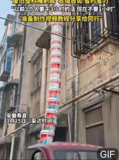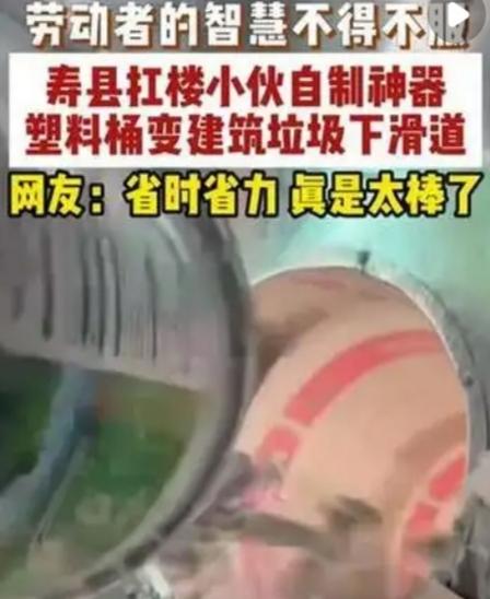 安徽扛楼小伙自制“垃圾神器”爆火:真正的智慧,从来都藏在烟火气里 “太有智慧了!”安徽寿县,这位天天和建筑垃圾打交道的扛楼小伙,用最不起眼的废旧塑料桶,造出了让全网点赞的干活神器,彻底改写了又累又慢的搬运日常。 谁都懂扛楼的苦,尤其是老小区没电梯,砖头、碎石、装修废渣,又重又硌人,一袋袋扛在肩上,腰弯得直不起来,肩膀磨得通红刺痛,一趟趟上下楼,汗水浸透衣衫,干一天活浑身像散了架。以前3个人合力,光搬一栋楼的建筑垃圾,就得熬整整3小时,累到胳膊抬不起来是常态,可生活的担子,再沉也得咬牙扛。 没人想到,这个天天干体力活的小伙,没读过多少设计书,没靠任何高科技,只是盯着手里的废旧塑料桶灵机一动,就造出了省时省力的滑道神器。他把废旧塑料桶巧妙拼接,做成可伸缩的运输通道,垃圾顺着桶体顺滑下滑,不用再肩扛手拎,以前3小时的工作量,如今不到1小时就能轻松搞定,效率直接翻了好几倍,网友纷纷感叹:下垃圾变得如此丝滑! 这哪里是一个简单的小发明,分明是底层劳动者对生活的温柔对抗。我们总觉得智慧遥不可及,是科学家的专利、是精英的专属,可这位小伙用行动告诉我们,真正的智慧,从来都藏在为了好好生活而努力思考的瞬间里。 他没有抱怨工作辛苦,没有认命般重复疲惫,而是用心琢磨怎么让日子轻松一点,怎么让体力活少点煎熬。更暖心的是,小伙还打算做教程分享给同行,让更多干苦力的工友少受累、多省心。 这世间最动人的,从来不是惊天动地的壮举,而是普通人在烟火日子里,不认输、肯动脑、懂共情的模样。为这位用心生活的小伙点赞,也愿每一个努力打拼的人,都能被生活温柔以待,用自己的小智慧,把苦日子过成甜。安徽扛楼小伙 民间高手