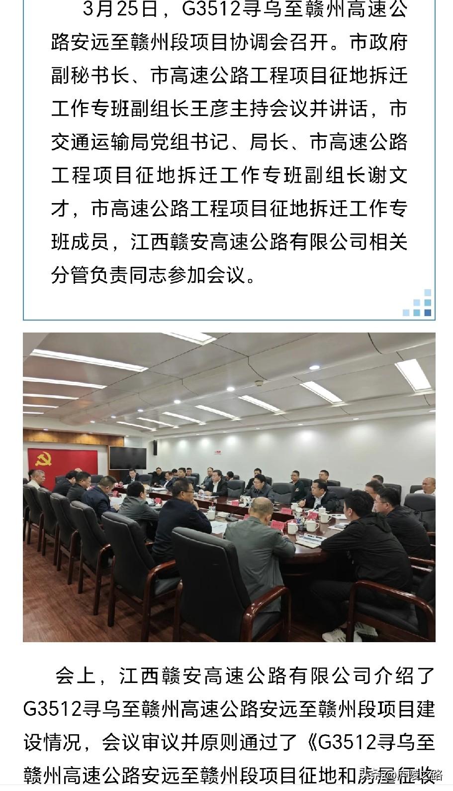 好消息,赣州寻乌至赣州高速公路安远至赣州段项目协调会召开,寻赣高速又进了一步。 会上,江西赣安高速公路有限公司介绍了G3512寻乌至赣州高速公路安远至赣州段项目建设情况,会议审议并原则通过了《G3512寻乌至赣州高速公路安远至赣州段项目征地和房屋征收补偿及规费缴交标准》,市高速公路工程项目征地拆迁工作专班办公室对项目下一步征地拆迁工作进行了部署。