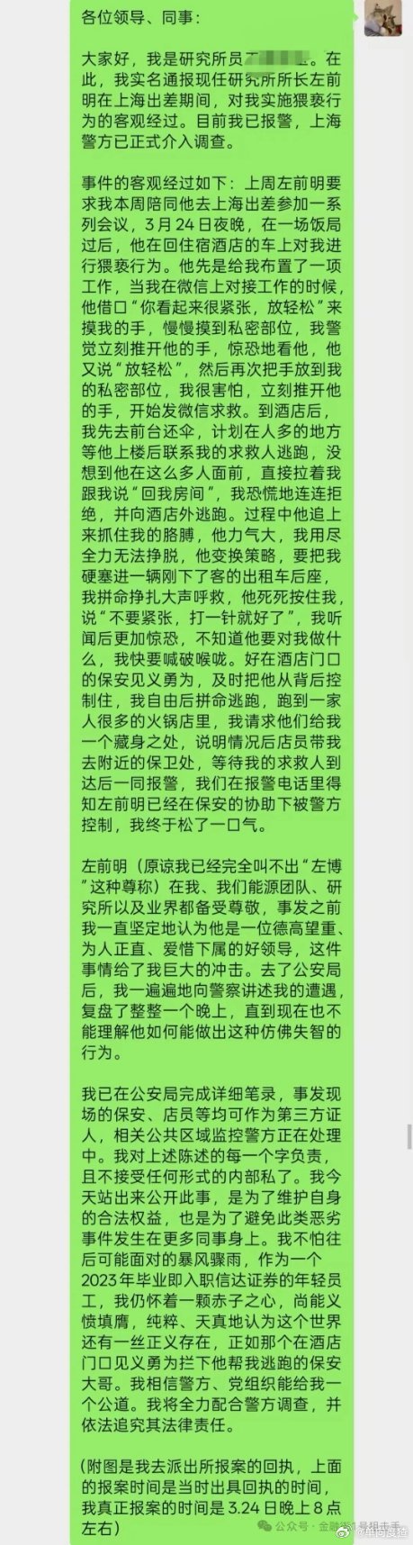 上海警方通报女子出差遭领导猥亵 警方已经采取刑事措施,相信案件会得到全面公正的调查处理,当事人也会受到严厉惩罚。让人奇怪的是,左前明为何如此胆大?在明知女下属不同意的情况下,竟然能够当众猥亵丝毫没有顾忌,拿着自己的各种前途干这样的事情,到底图什么?是喝醉了还是怎么如此没理智?