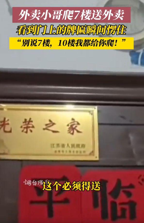 七楼奔波遇荣光,外卖小哥心潮涌 江苏街头的一趟普通配送,竟让奔波劳碌的外卖小哥瞬间忘却身心俱疲,这般触动,怎不叫人动容? (个人观点仅供参考,无任何不良引导) 市井之中,众生皆为生活奔忙。江苏的这位外卖小哥,日日穿梭于车水马龙之间,顶风冒雨,步履不停,只为多接一单、多挣一分血汗钱,日子平凡又辛劳。一日接单,目的地竟是无电梯的老式居民楼七楼。七层高楼,无梯可乘,徒手攀爬,本就是件苦差事,换作旁人,难免心生抱怨,小哥亦是心头一沉,却依旧扛起餐品,迈步踏入楼道。 楼道狭窄昏暗,台阶陡峭逼仄。小哥拾级而上,步履渐沉,每上一层,气喘更甚,汗流浃背,衣衫尽湿。双腿酸软无力,每一步都似有千斤重担,满心只盼速速抵达,交付餐食稍作歇息。费尽气力登上七楼,他已是筋疲力尽,抬手欲叩门,目光轻扫门板,两块熠熠生辉的牌匾赫然入目,赫然写着“英雄之家”。 这一瞬,小哥呆立原地,瞠目结舌,满心疲惫荡然无存。寻常人家多见寻常门饰,这般沉甸甸的牌匾,实属罕见。“英雄之家”四字,金光熠熠,字字千钧,承载着无上荣光,更藏着舍小家为大家的无私奉献。世人常说,吃水不忘挖井人,我们能享现世安稳,皆因英雄挺身而出,以热血守护山河无恙。英雄已逝,荣光犹存,其家人守着这份荣耀,默默度日,更值得世人敬重。 小哥常年奔走四方,见过人间百态,此刻望着牌匾,敬意油然而生,满心只剩震撼与尊崇。方才抱怨爬楼辛苦,此刻只觉羞愧万分,区区七楼台阶,与英雄的付出相比,不过是沧海一粟,何累之有?别说七楼,即便十楼、二十楼,能为英雄家人送上一餐,亦是心甘情愿,倍感荣幸。 平凡之人,亦有赤诚之心。外卖小哥为生计奔波,是芸芸众生里的普通人,却在遇见英雄荣光的刹那,展露最纯粹的敬畏之心。这份相遇,无关身份地位,只关家国情怀,只关感恩之心。平凡日子里,英雄精神从未远去,普通人的敬意,便是对英雄最好的告慰。心存敬畏,行有所止,懂得感恩,方得始终,这便是这小小一幕,留给我们最珍贵的启示。
