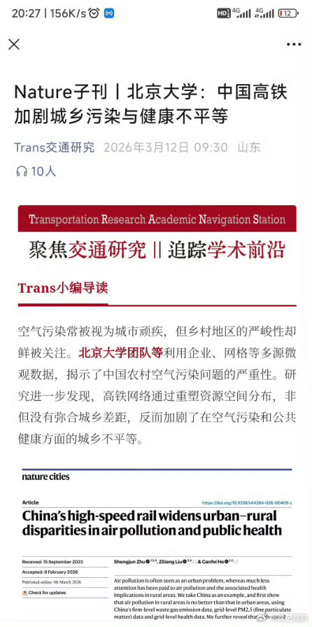 有些自媒体报道标题有点太危言耸听。原来的研究仔细看并没那么夸张。只是提出高铁发展带来的红利,农村不如城市来的多。农村也有改善但城市明显改善更快。建议加大对乡村发展的补贴。提出的观点是:未来的公共政策必须走向包容性的制度设计。充分享受高铁经济与环境双重红利的城市中心区,理应通过设立跨区域专项绿色基金,对周边的农村地带进行生态反哺;同时,应鼓励掌握先进减排技术的高新企业构建城乡技术帮扶网络,彻底打通绿色技术下沉的通道。我个人觉得这个研究没啥问题。是有些自媒体炒作时故意突出高铁。