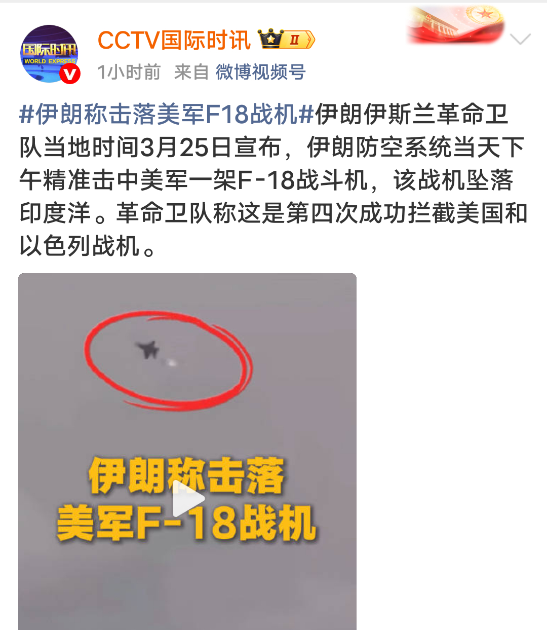突发:伊朗称首次击落一架美军F-18舰载战机,这是步f35的后尘了!根据CCTV