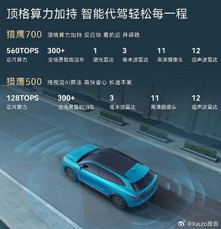 辅助驾驶部分,高配两款车型可花钱选装升级猎鹰700辅助驾驶,包括车顶激光雷达+地平线征程6P辅助驾驶芯片以及智驾小蓝灯等,共27颗传感器,算力560TOPS,支持城市NOA、高速NOA双场景领航和全场景自动泊车等。