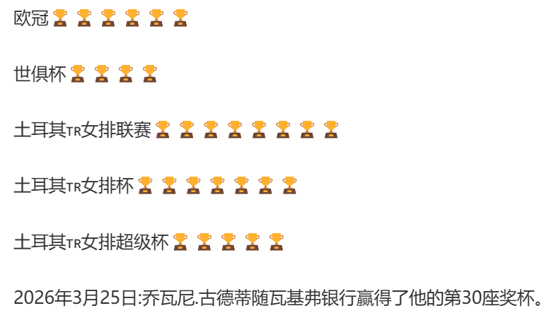 古德蒂真有眼光和指挥能力! 随着瓦基弗银行女排战胜伊萨在本赛季土耳其杯赛的夺冠,古德蒂带领球队已经获得欧冠、土耳其联赛、世俱杯在内的第30座奖杯,而他在2008年选择瓦基弗,说明他真有眼光和真有指挥的能力,而且在接下来联赛的半决赛将再对阵伊萨,大概率能再进决赛从而夺得第31座奖杯!