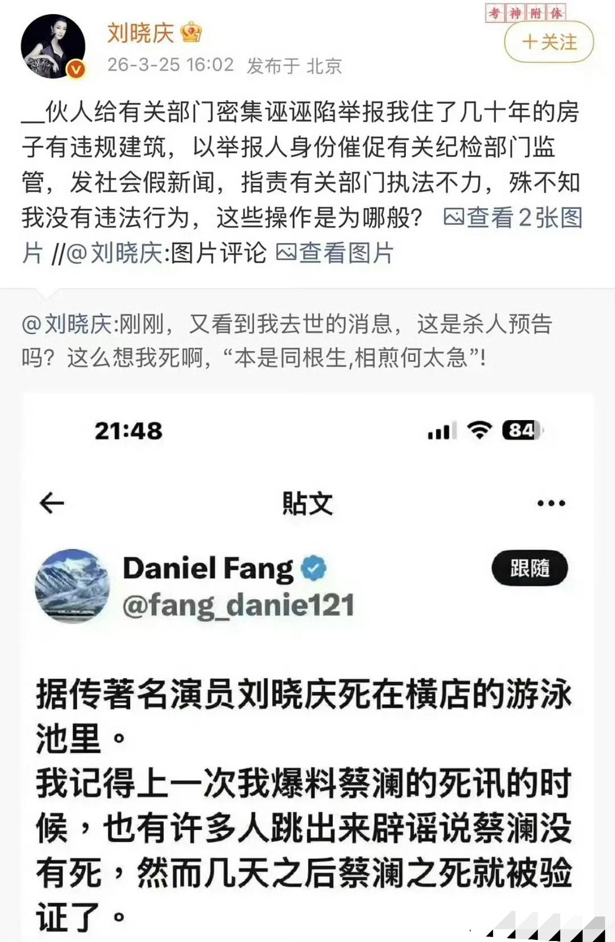 刘晓庆妹妹的儿子刚出生40天。就被刘晓庆接手抚养。把他当亲儿子,让他上贵族学校,为他买房买车,送出国留学。光是亚运村对面,就买了一整栋单元楼。 然而,刘晓庆的无私付出,换来的却是妹妹一家的贪得无厌。妹妹和妹夫希望她没有后代,这样她就可以全心全意对外甥了。 从外甥40天到30多岁,刘晓庆一直在出钱出力。可妹妹一家却换了锁,连门都不让她进。 刘晓庆曾在节目中说,家人对她比外面的人还要狠。如今,亲外甥公然造谣她的死讯,果然验证了这一点。不会是妹妹一家人想要吃她的绝户吧? 刘晓庆的那句“这是杀人预告吗”,听起来让人后背发凉。感觉刘晓庆现在的处境好危险啊。