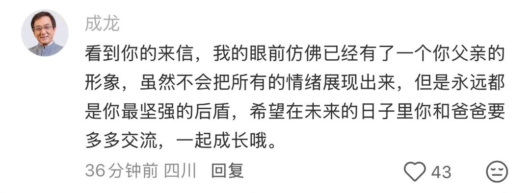 原来给成龙写信真的会被回复成龙给10年剧粉写信了成龙大哥亲笔回信太温柔,鼓励迷茫年轻人、开导父女关系,银幕传奇私下也这么暖心。《捕风追影》高能对决超带感,戏里是硬汉,戏外是温柔前辈,双向奔赴太好哭。3月27日峨眉山,成龙、此沙、文俊辉空降现场,沉浸式场景等你赴约,共赴这场温暖之约!