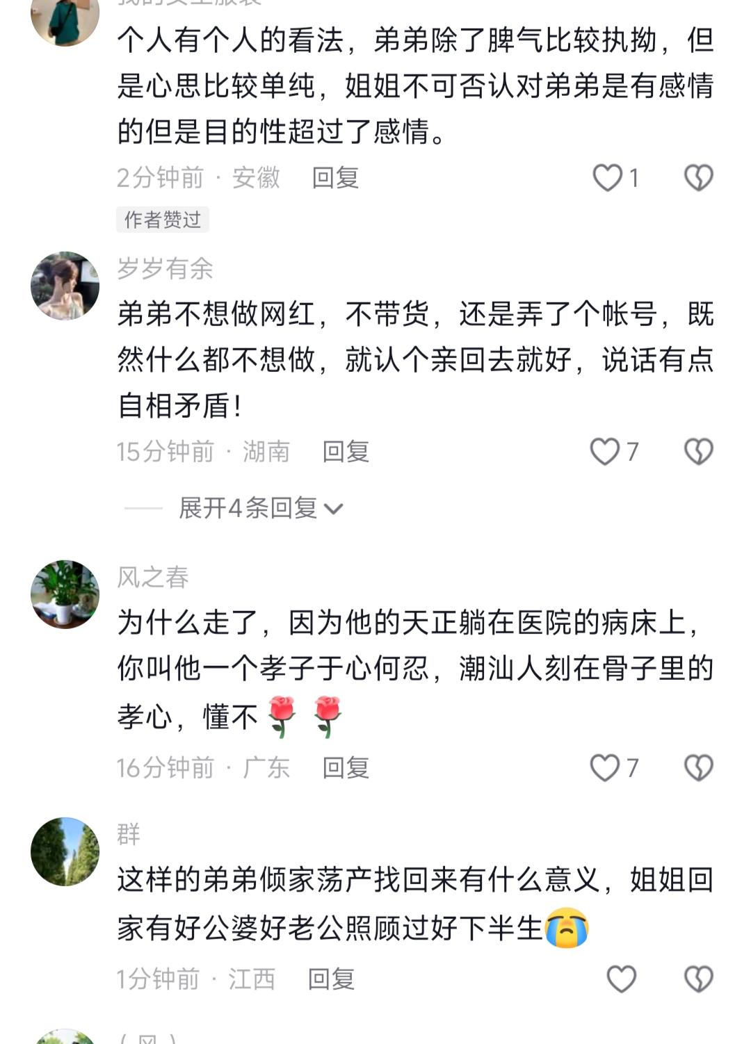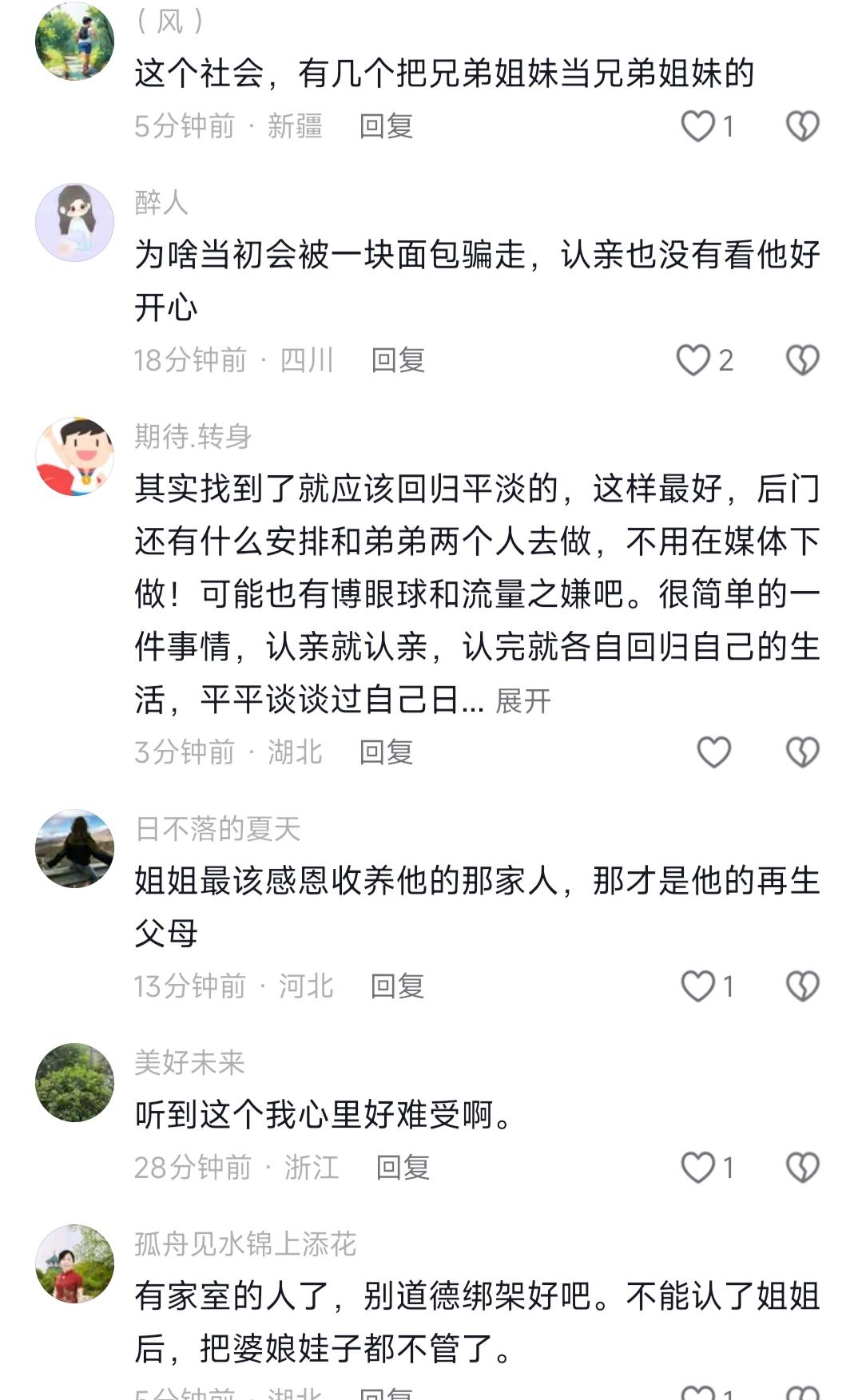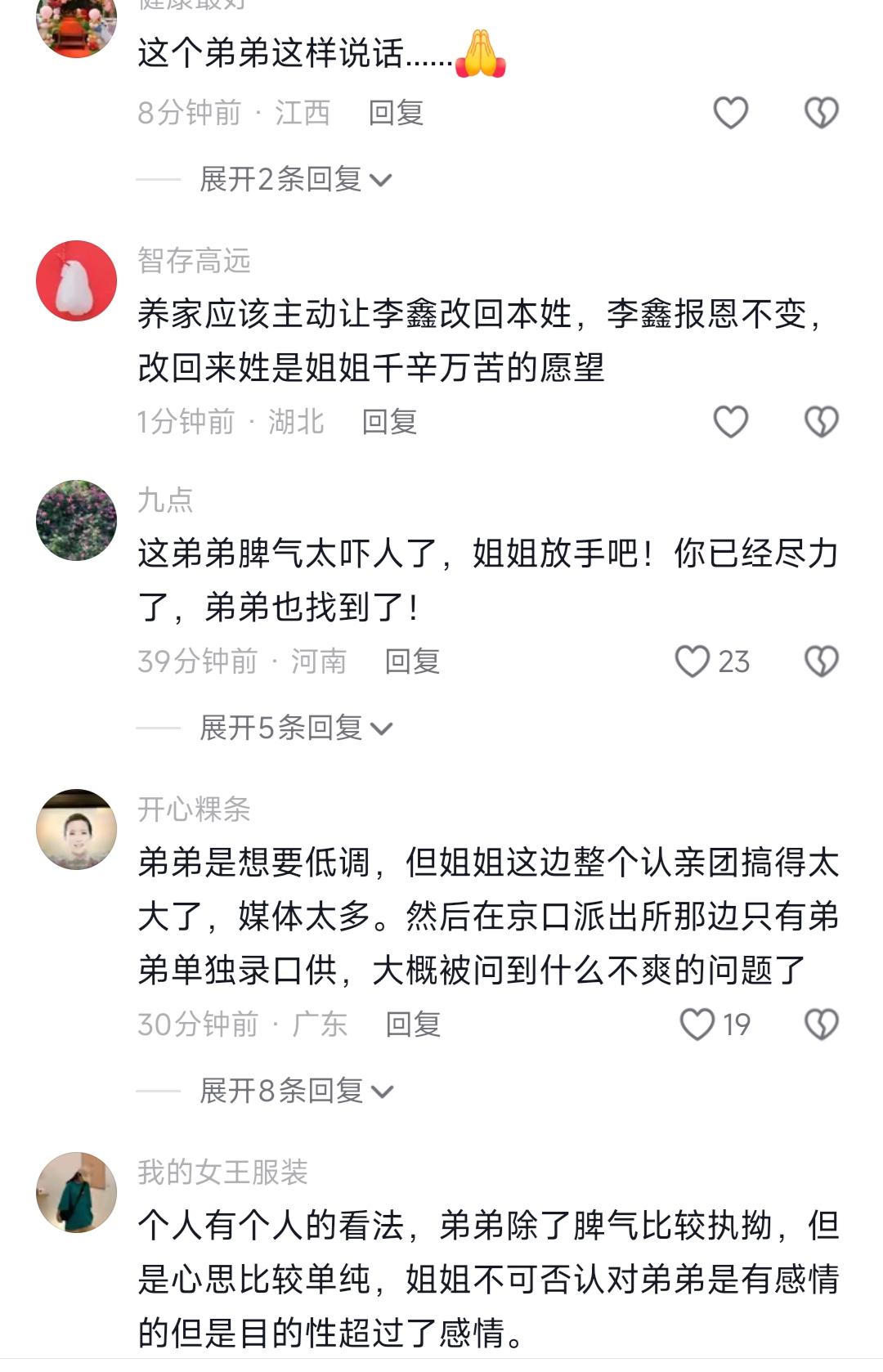 看到李鑫姐弟认亲,我忍了 看到李鑫姐姐找了弟弟33年才能找到,我也忍了 可看到李鑫说想做个平凡人,不想带货,也不想改名字,我实在忍不了了 说真的,最近刷李鑫姐弟寻亲的事,我越看越郁闷,前阵子刚刷到他们相认,还觉得33年终于找到人太给力了,结果转头就闹到放话“姐弟都没得做”的地步,我晕,好好的久别重逢,怎么就硬生生闹成了一地鸡毛? 老实讲,我真的太能理解李鑫的处境了。养父住院躺着,老婆在家连环call喊着孩子没人带,自己工作生活全在广东,养家这边的事早就全靠他搞掂,本来想陪着亲姐把认亲的事顺顺当当走完,结果发现自己夹在中间,往左对不起养了自己一辈子的爹妈,往右对不起找了自己33年的亲姐,换谁不崩溃啊?反正换我,我肯定头都大了,大概率只会说随便,爱咋咋地。 之前听我妈说,我们小区就有个差不多的叔叔,小时候被抱养,四十多岁亲生家找过来,非要他改回原姓、逢年过节必须回亲生家,本来想两边都顾好,结果闹得养母气到住院,最后两边都生分了,好好的日子过得一团糟,不是吗? 说真的,很多人骂李鑫说话太绝,可谁看得到他背后的三个难处啊?嗯,亲姐要他改回本名,说他是李家三代单传,可他用了几十年的名字,早就和养家绑在一块了,哪是说改就改的?然后是带货的事,他就想过佛系的小日子,不想凑这个热闹,还有就是不想掺和亲姐那边的事,怕寒了养父母的心,这有错吗? 之前听人说过,所有关系都讲究个因缘具足,不是光有血脉就能凑到一块的。30多年的人生空白,不是一句“我是你亲姐”就能填满的,你非要一下子把所有期待都压在对方身上,换谁不躲啊?不是吧?难道就因为你找了33年,对方就要把自己的人生全盘推翻重来吗? 总之啊,我想说的是,不管是生恩还是养恩,都别逼对方按自己的想法来。慢一点,给彼此点缓冲的时间,麻溜的把自己当下的日子过好才是正经事,非要争个你对我错,最后只会两边都落空,你们说呢?李鑫浩爸爸