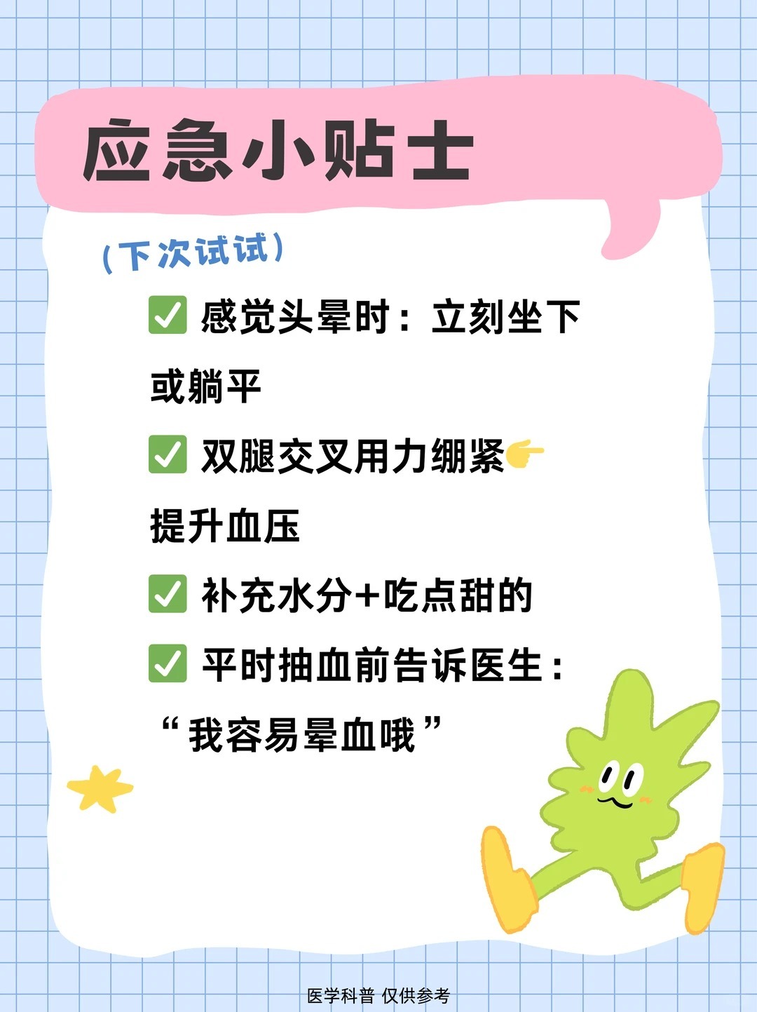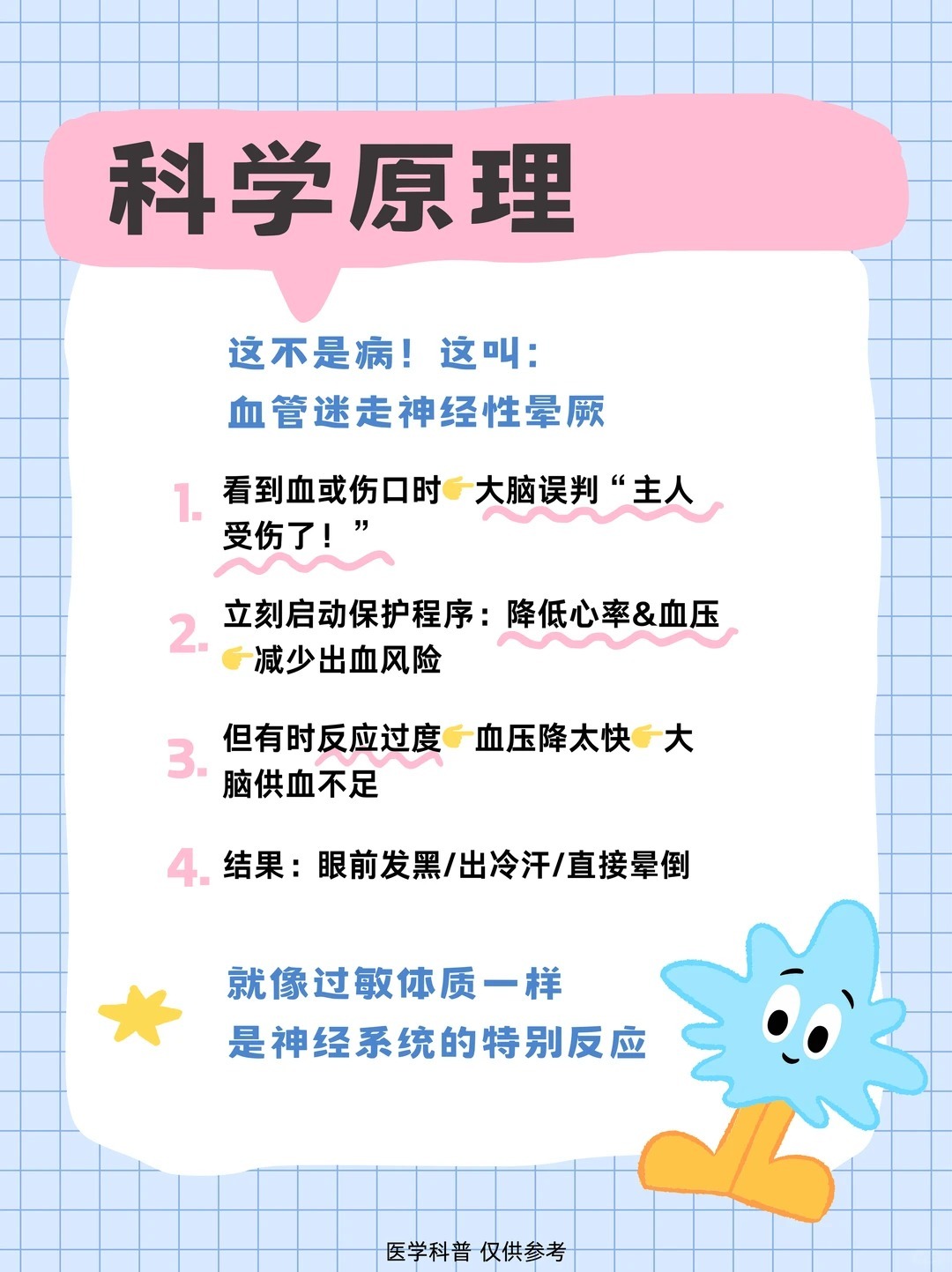男子切到手晕血边晕边爬去医院 晕血可能是血管迷走神经性晕厥导致的,身体在受到刺激后,心率突然减慢、血压骤降,导致大脑暂时缺血,从而引发短暂的意识丧失。一旦出现头晕、恶心、出冷汗等前兆,立刻坐下或躺下,抬高双腿,就能有效避免摔倒受伤。