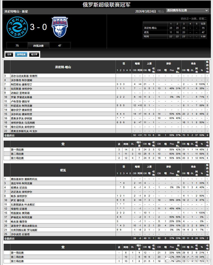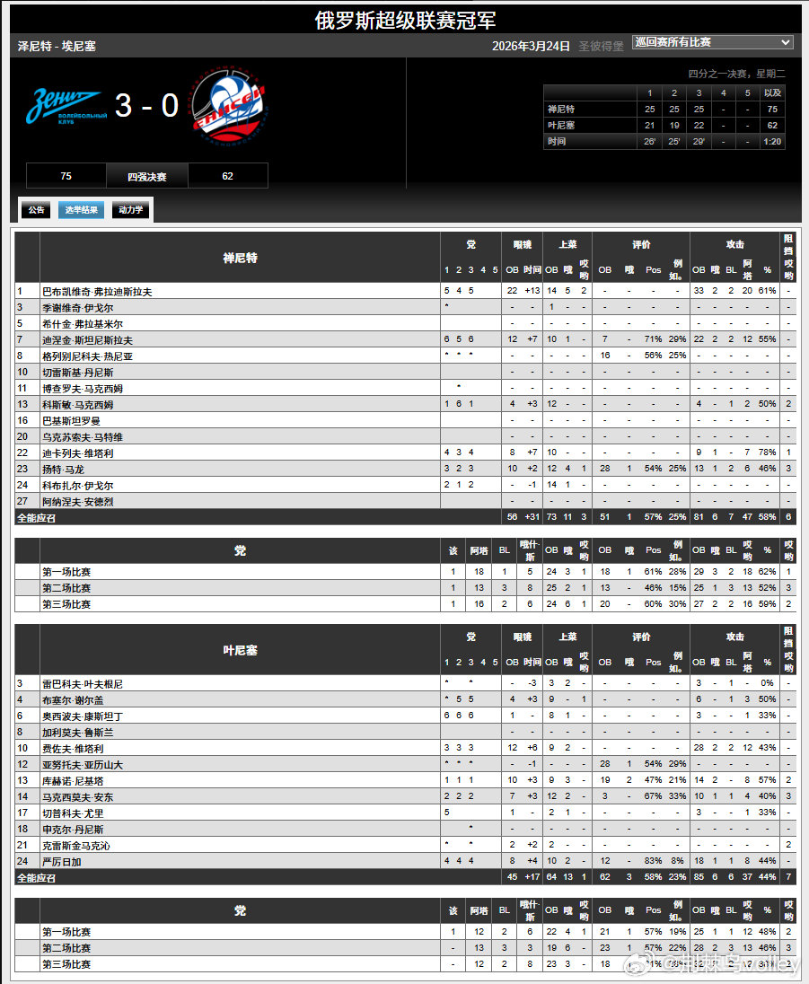 【俄超男排¼决赛首回合赛果】