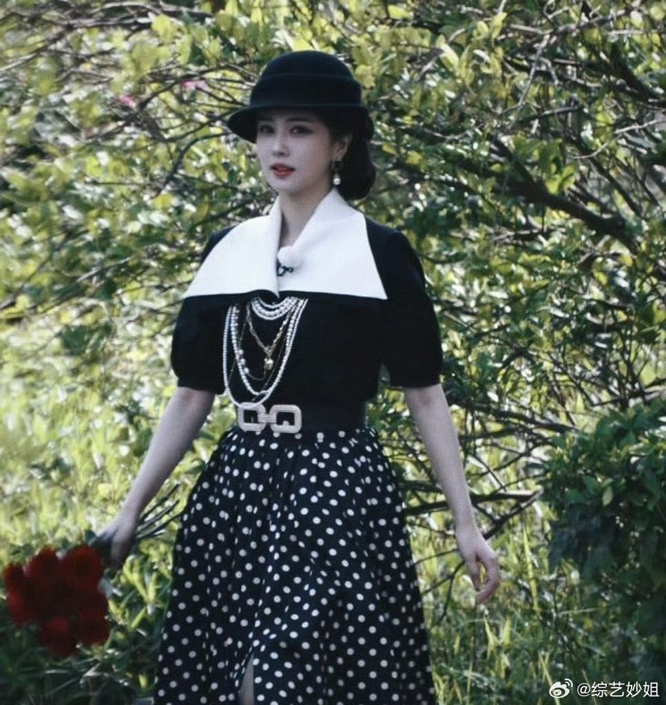 鹿儿好美吧白鹿奔跑吧造型封神现场!黑波点长裙搭配复古礼帽,气质端庄又灵动,标准的