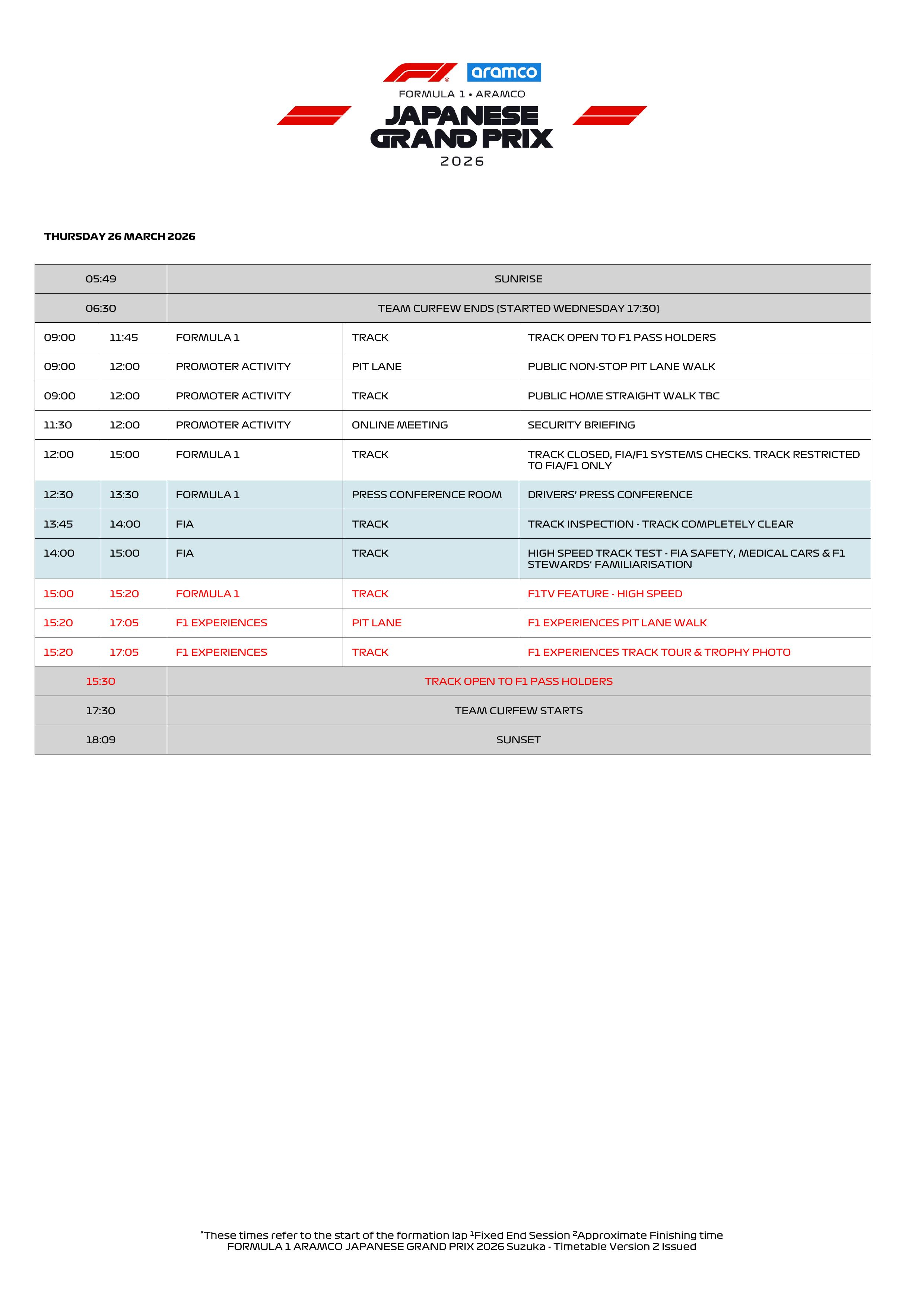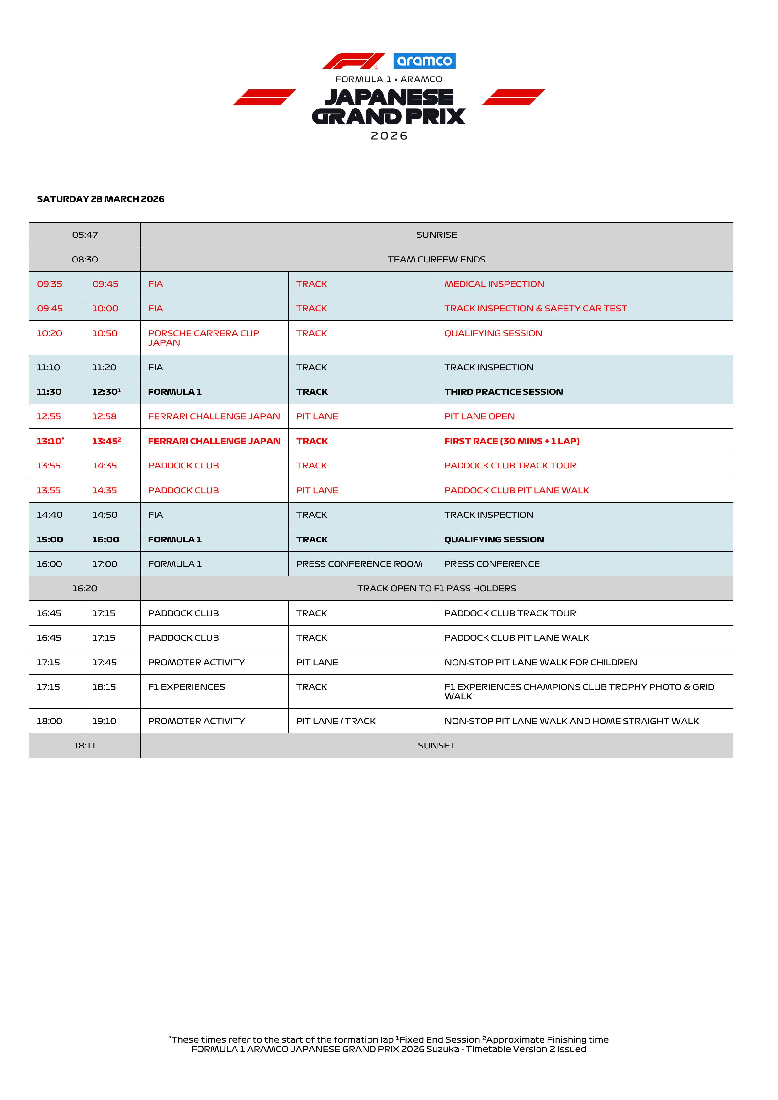 2026 F1日本大奖赛详细时间表(转化为北京时间需-1小时)