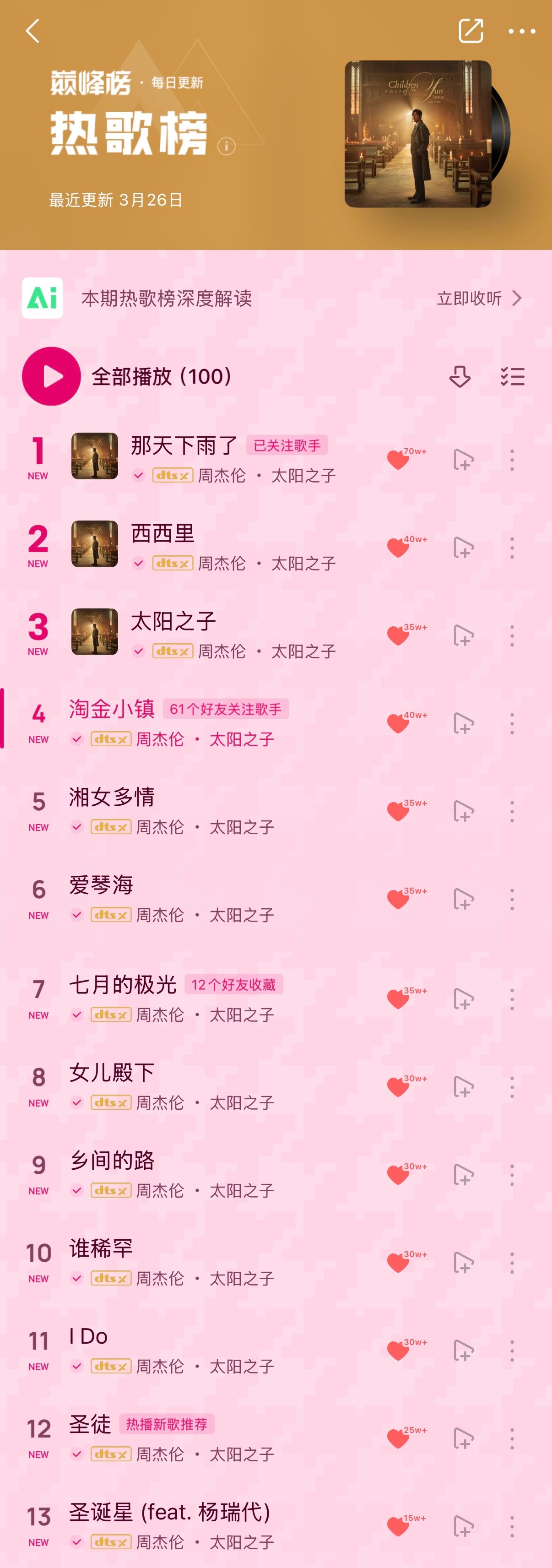 周杰伦新专辑太阳之子 周杰伦新专辑13首歌曲空降QQ音乐热歌榜&新歌榜前13